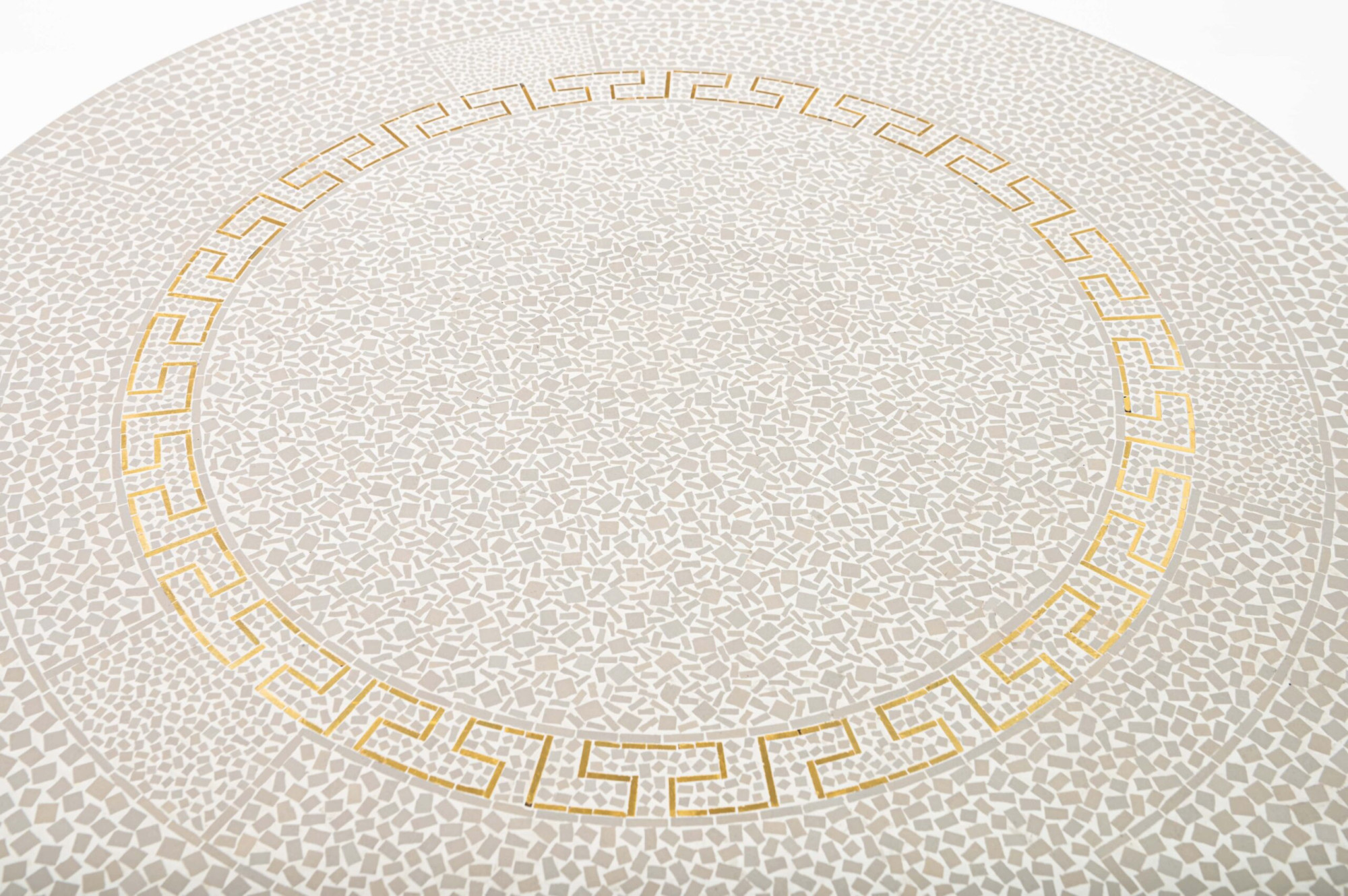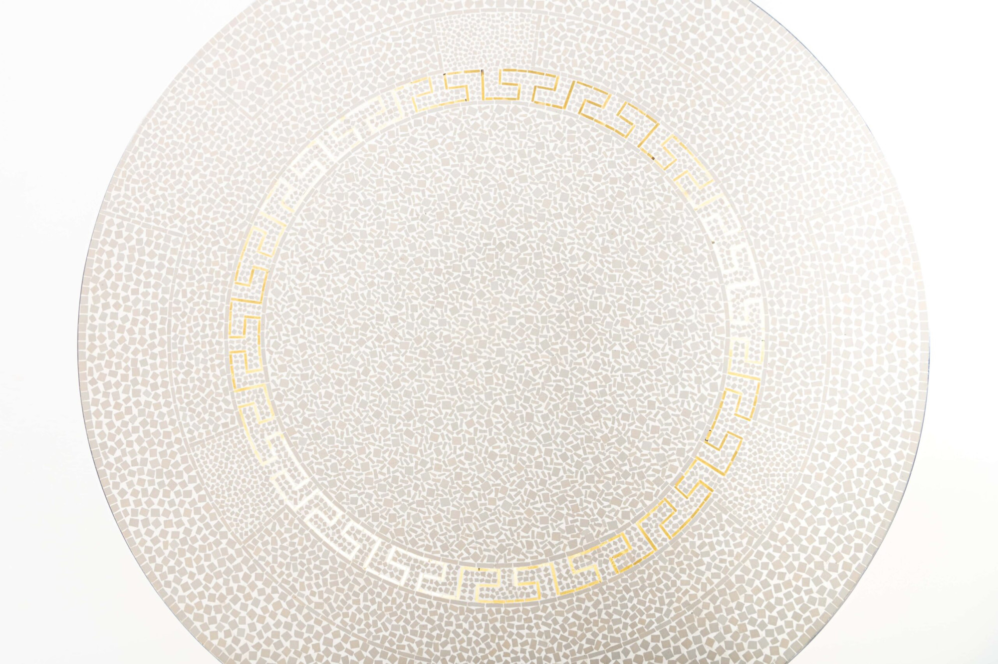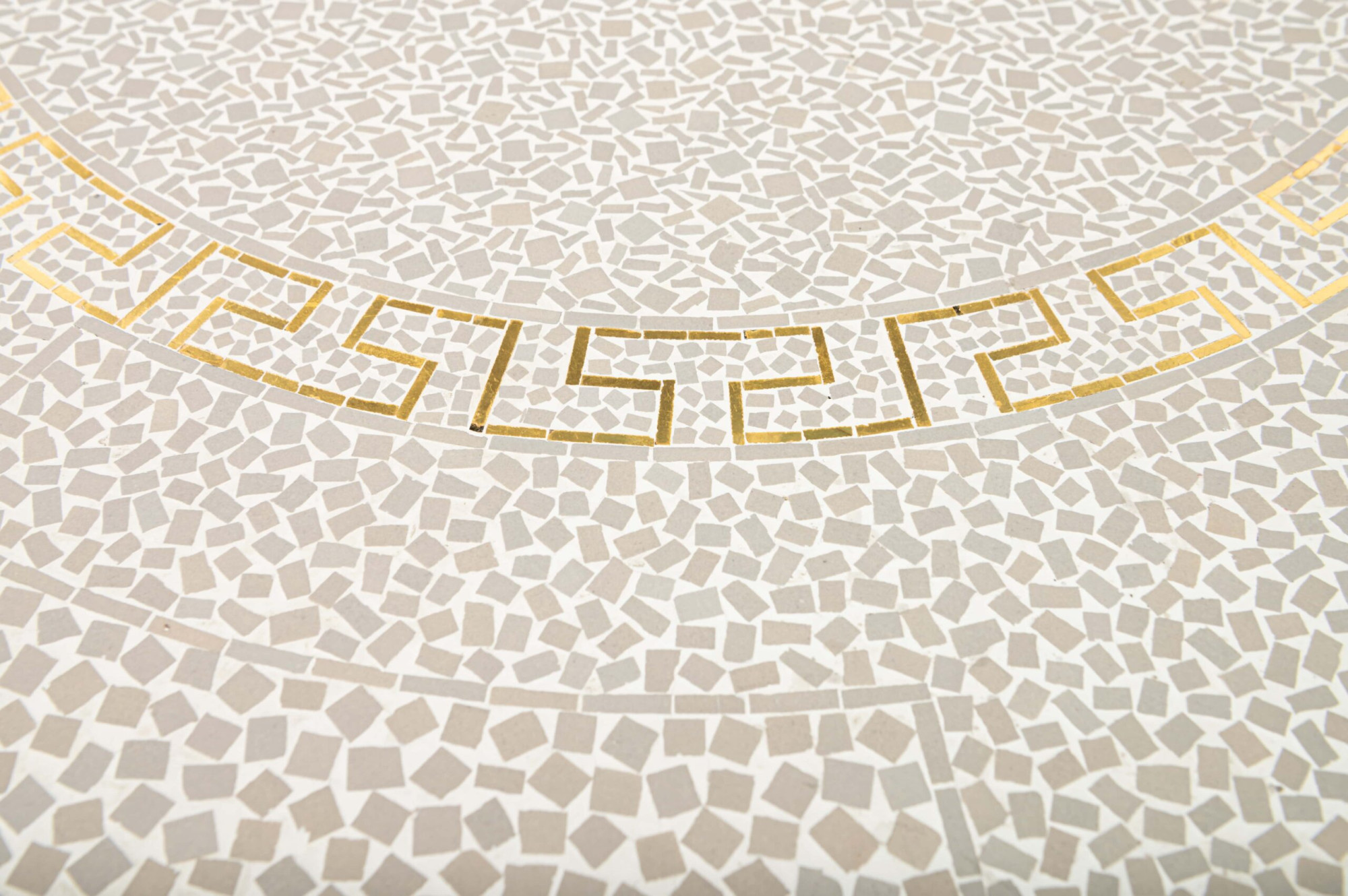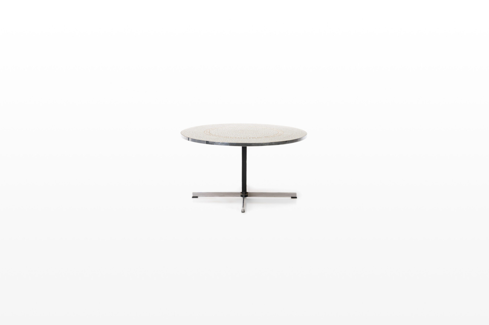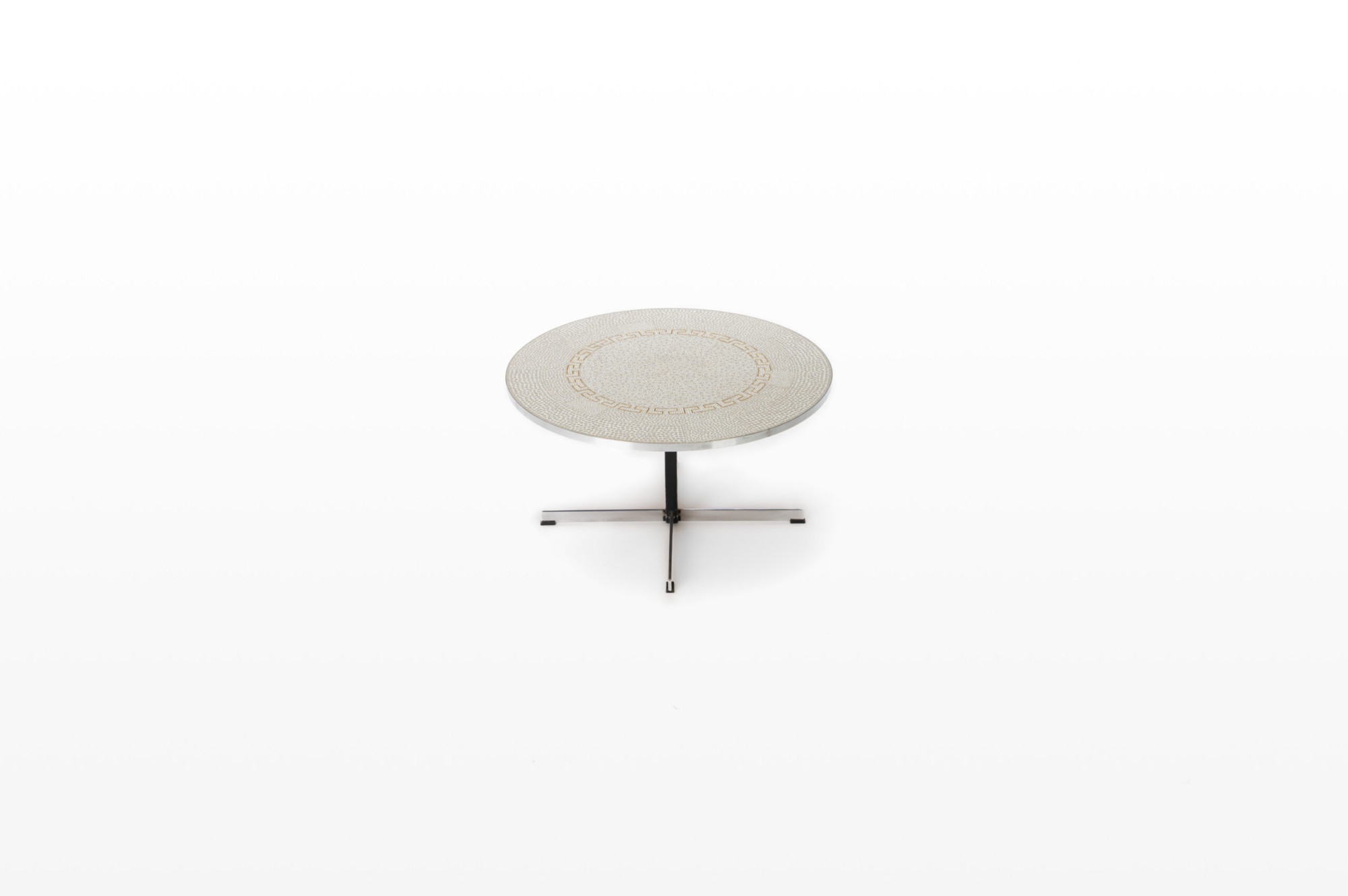 Vintage coffee table with chrome base with brass and a top with white and gold mosaic tiles.