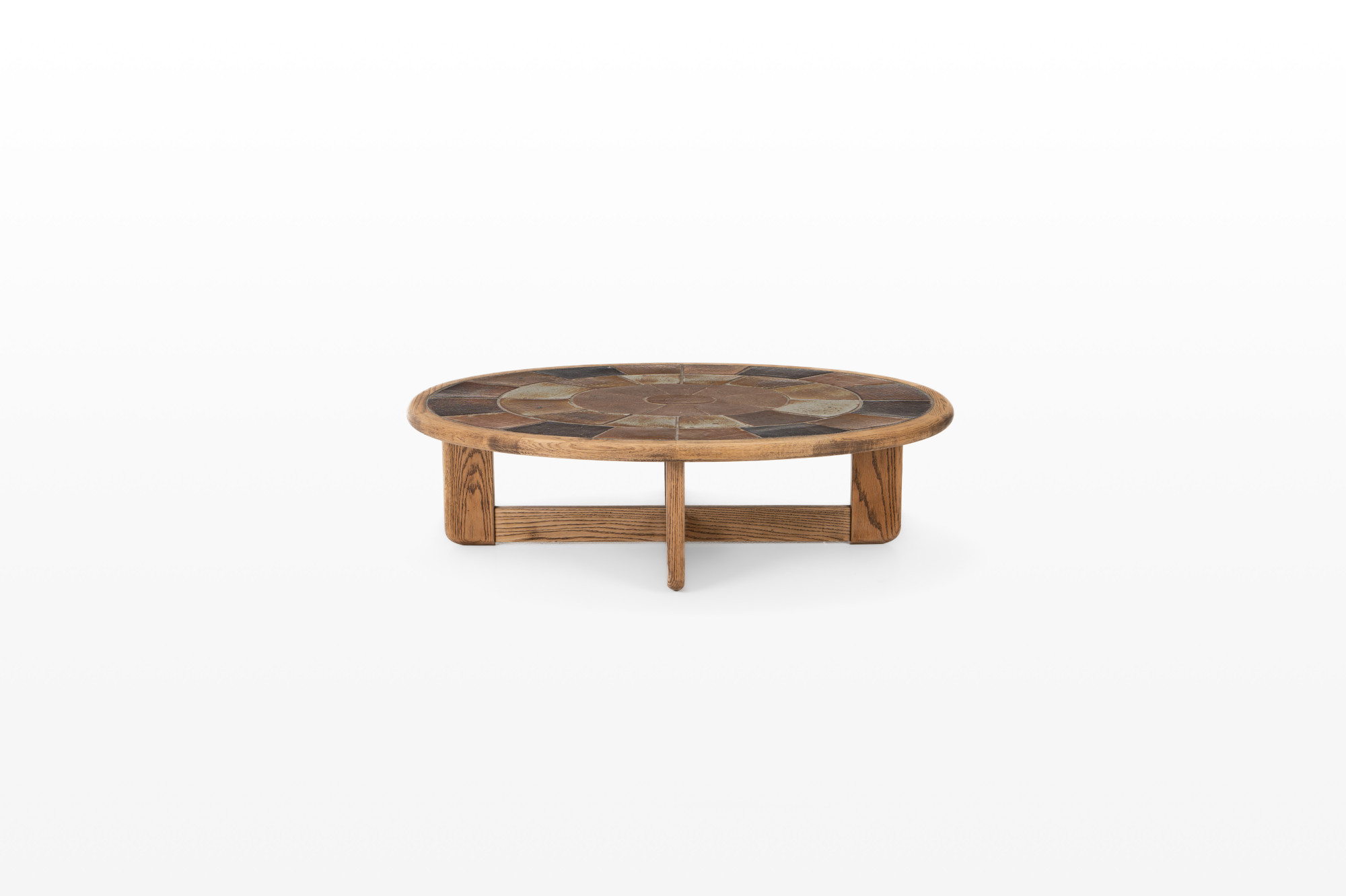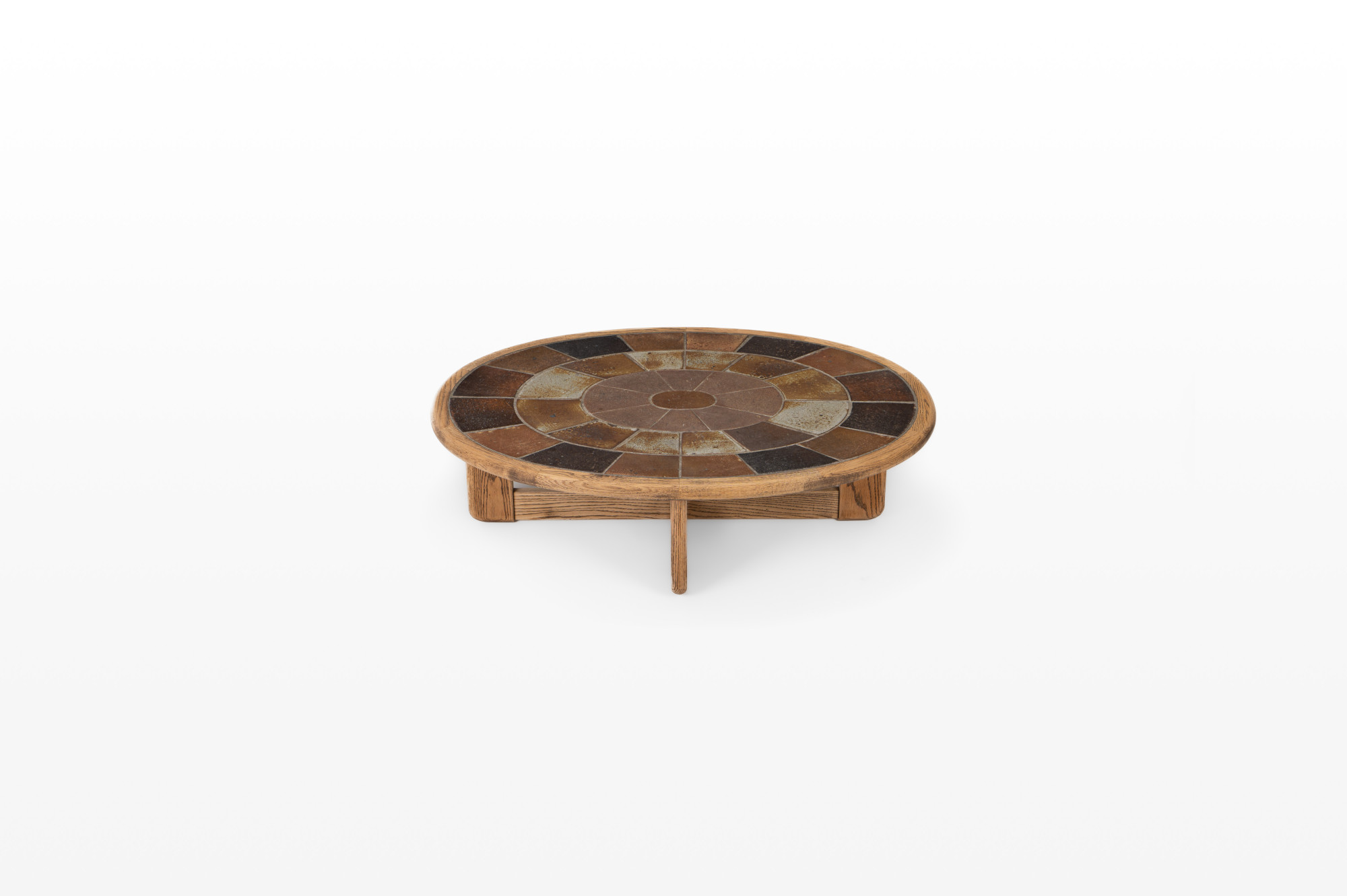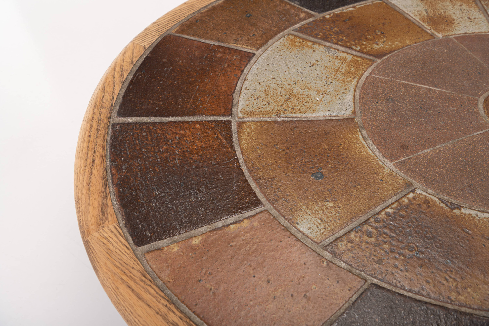Danish Brutalist coffee table designed by Tue Poulsen and made by Haslev Møbelsnedkeri, Denmark 1960s. It has a solid oak base and the top is inlaid with ceramic tiles. The table is in very good condition and the Danish control mark is present.