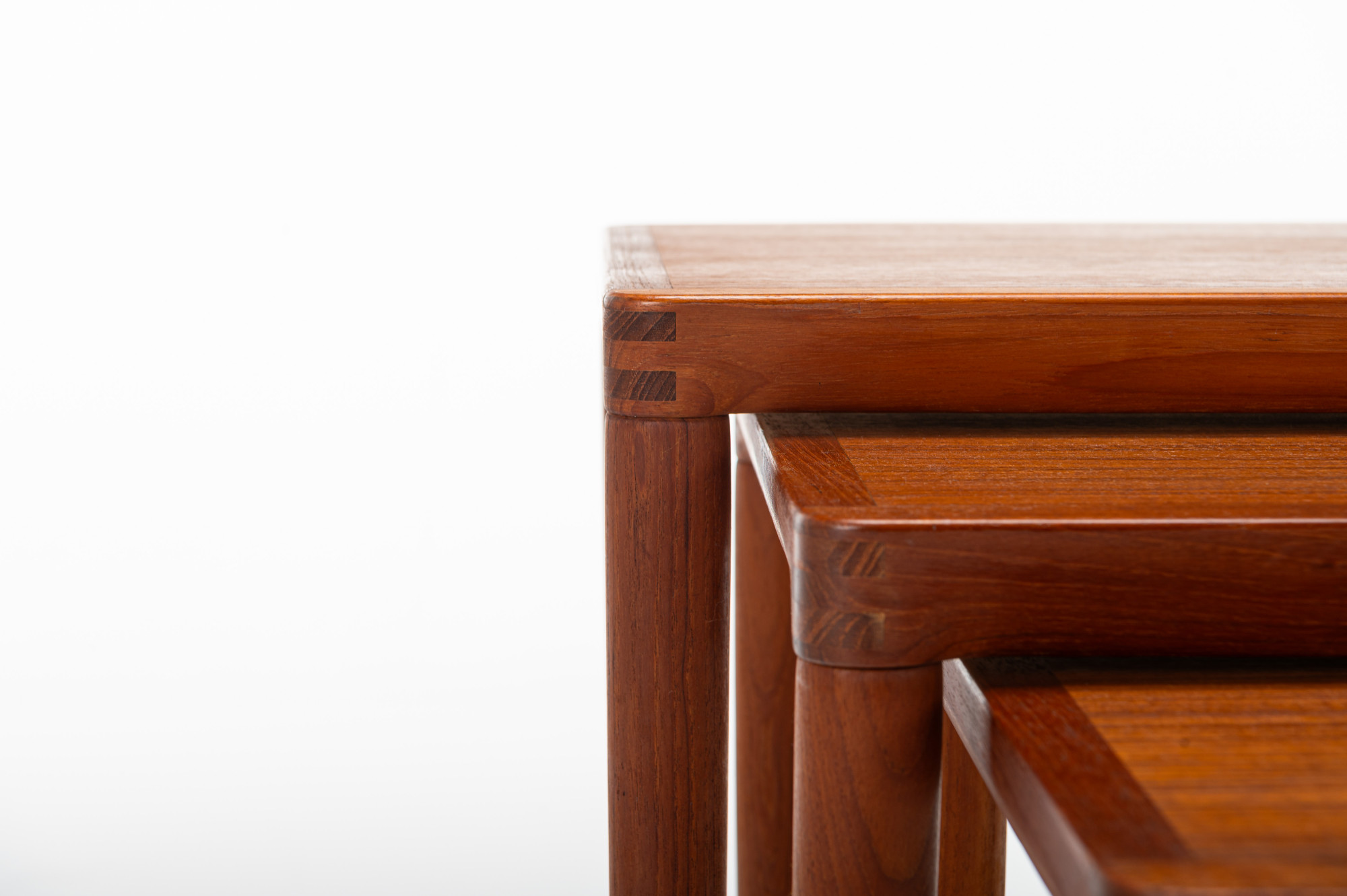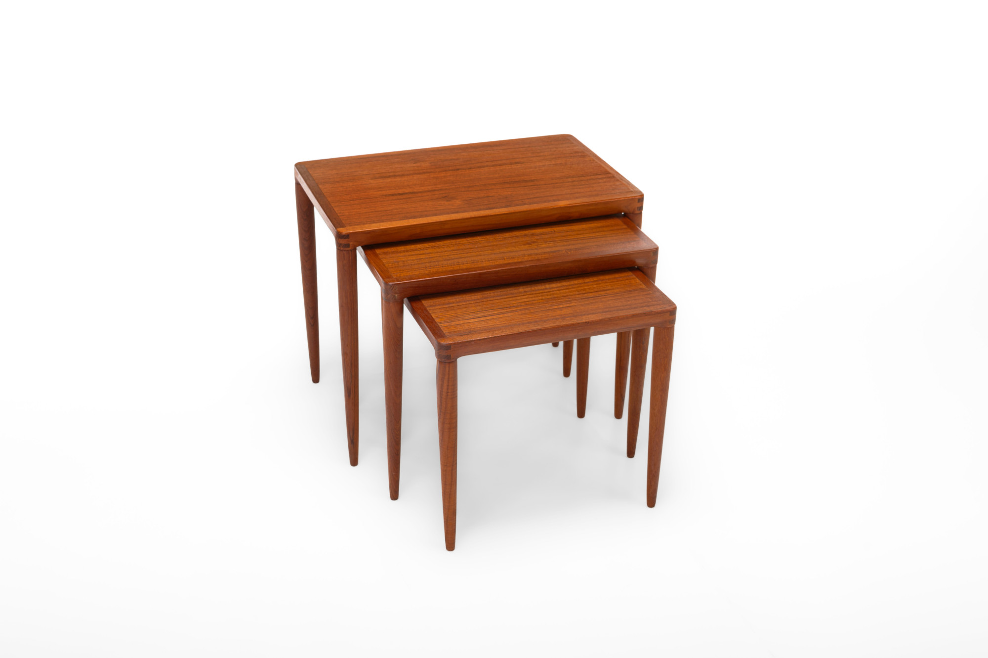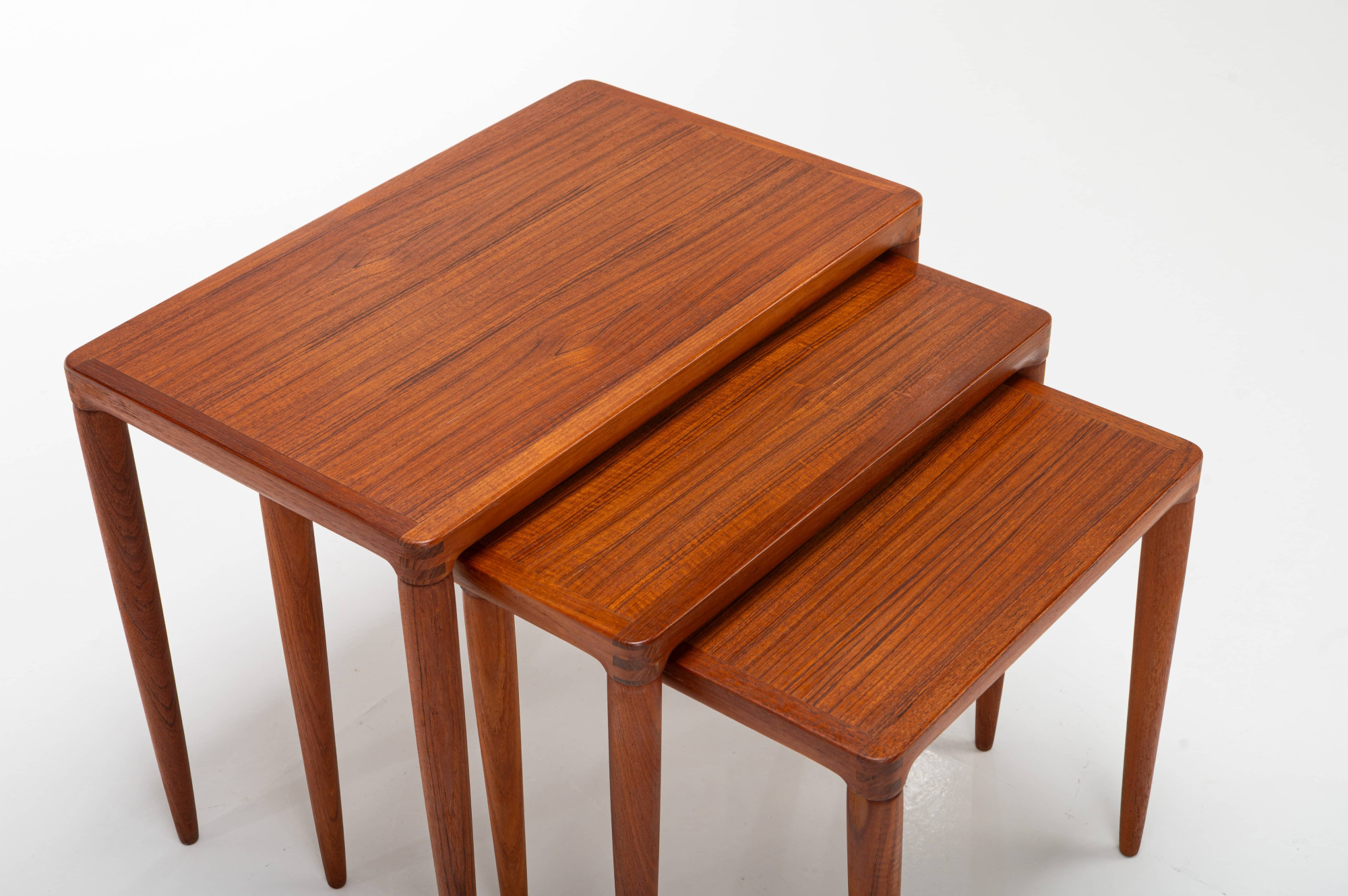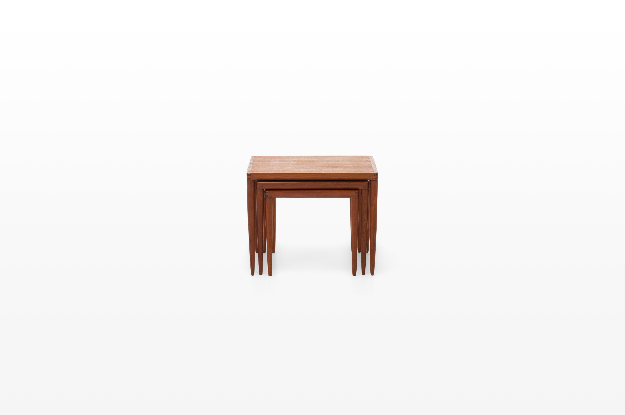 This vintage Danish teak nesting table set, designed by Henry Walter Klein for Bramin in the 1960s, is a classic mid-century piece. The three tables fit perfectly together, combining style and practicality. In great condition.