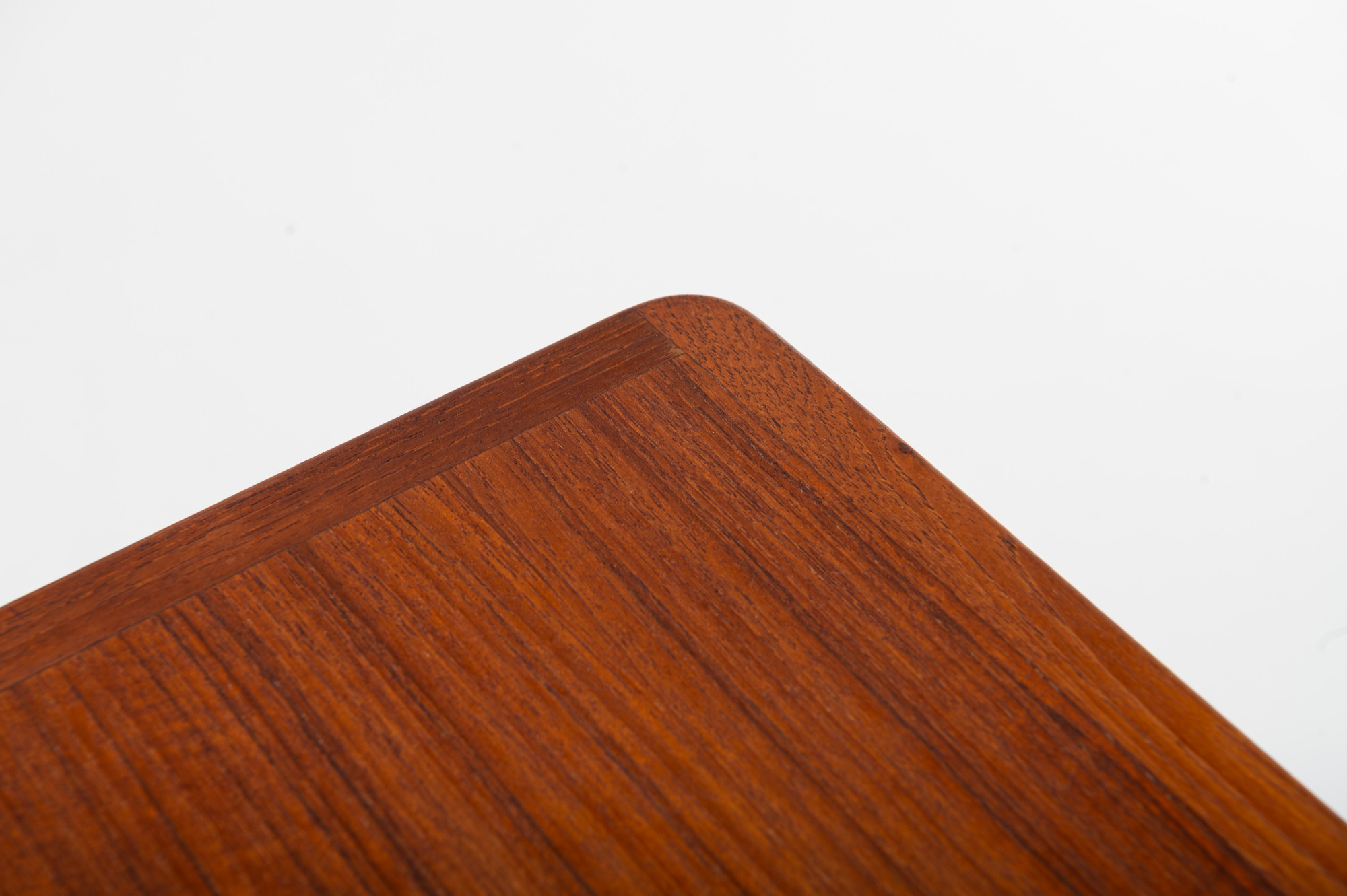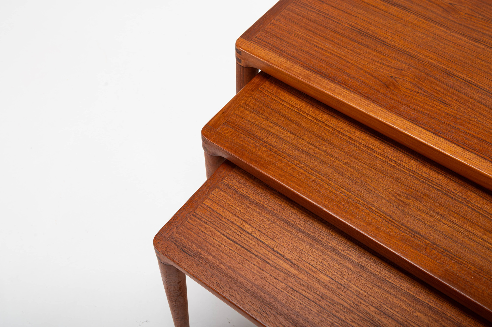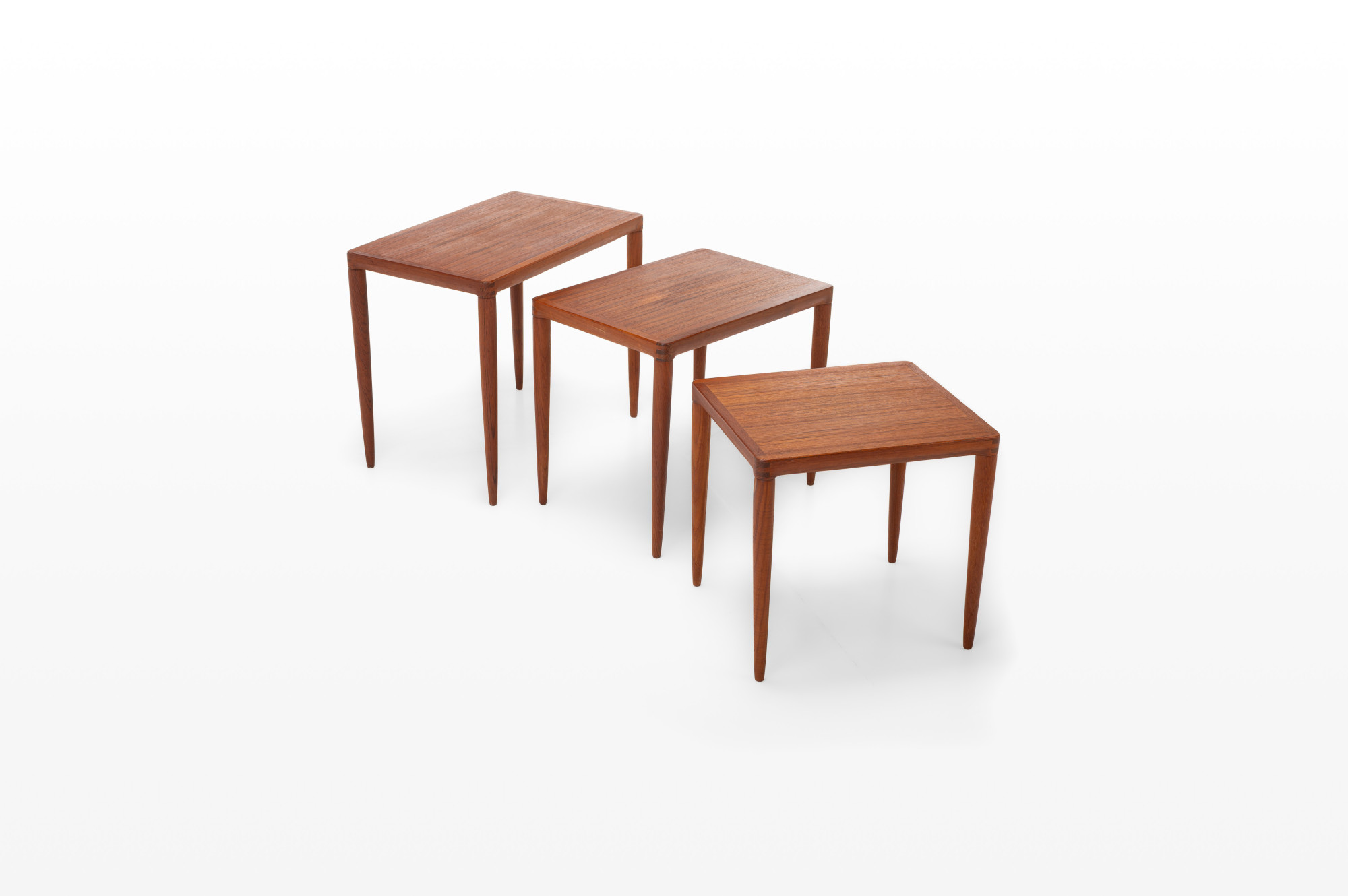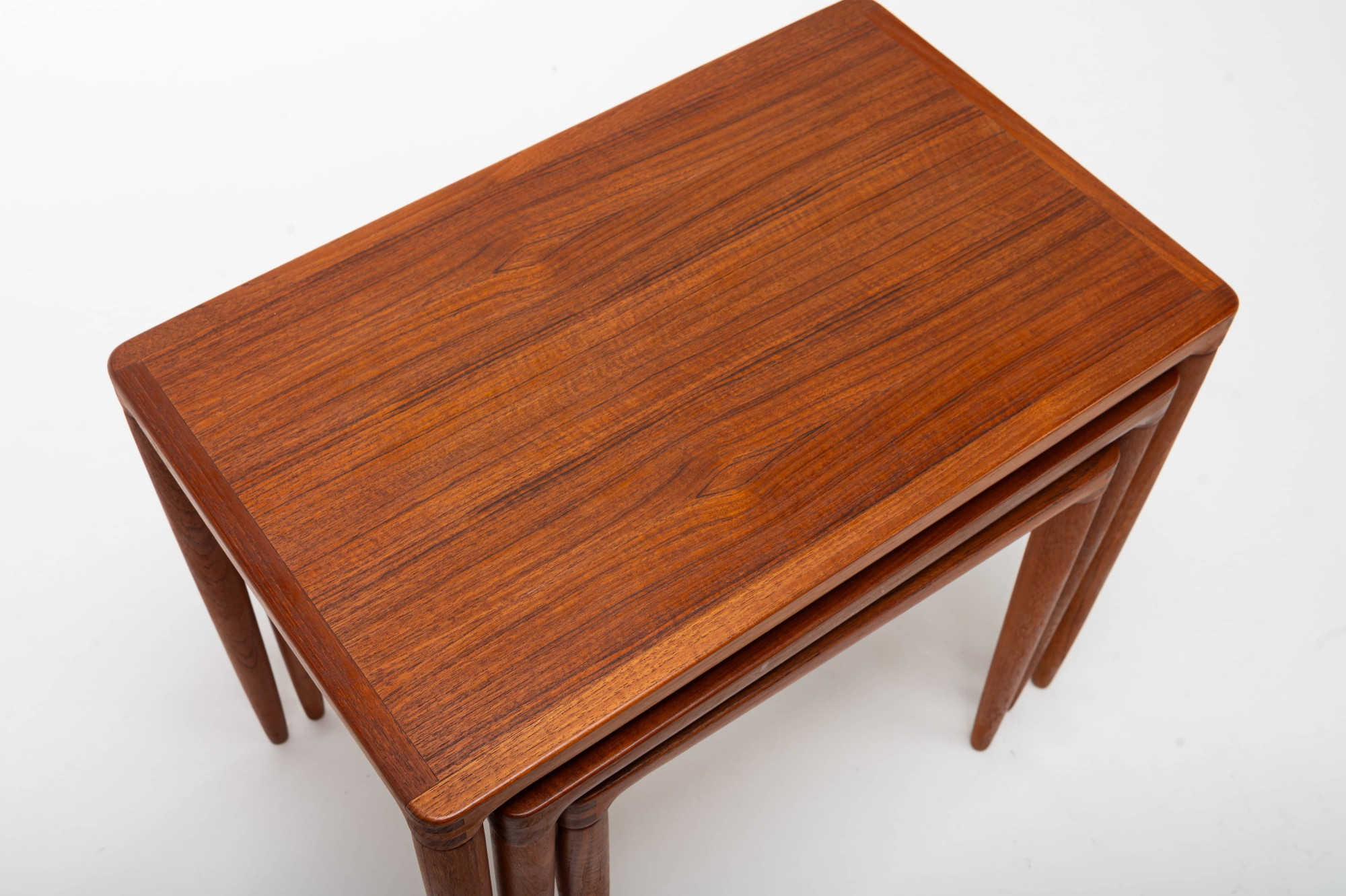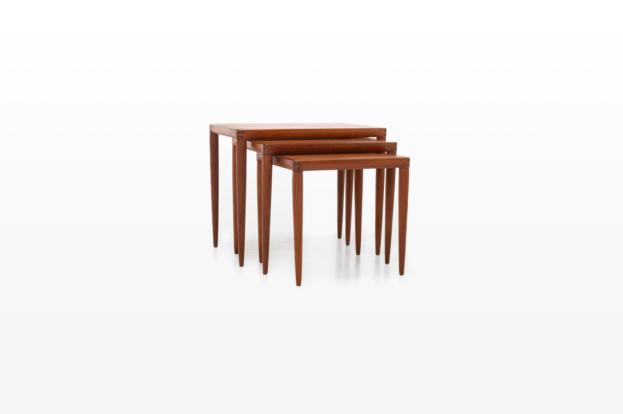 This vintage Danish teak nesting table set, designed by Henry Walter Klein for Bramin in the 1960s, is a classic mid-century piece. The three tables fit perfectly together, combining style and practicality. In great condition.