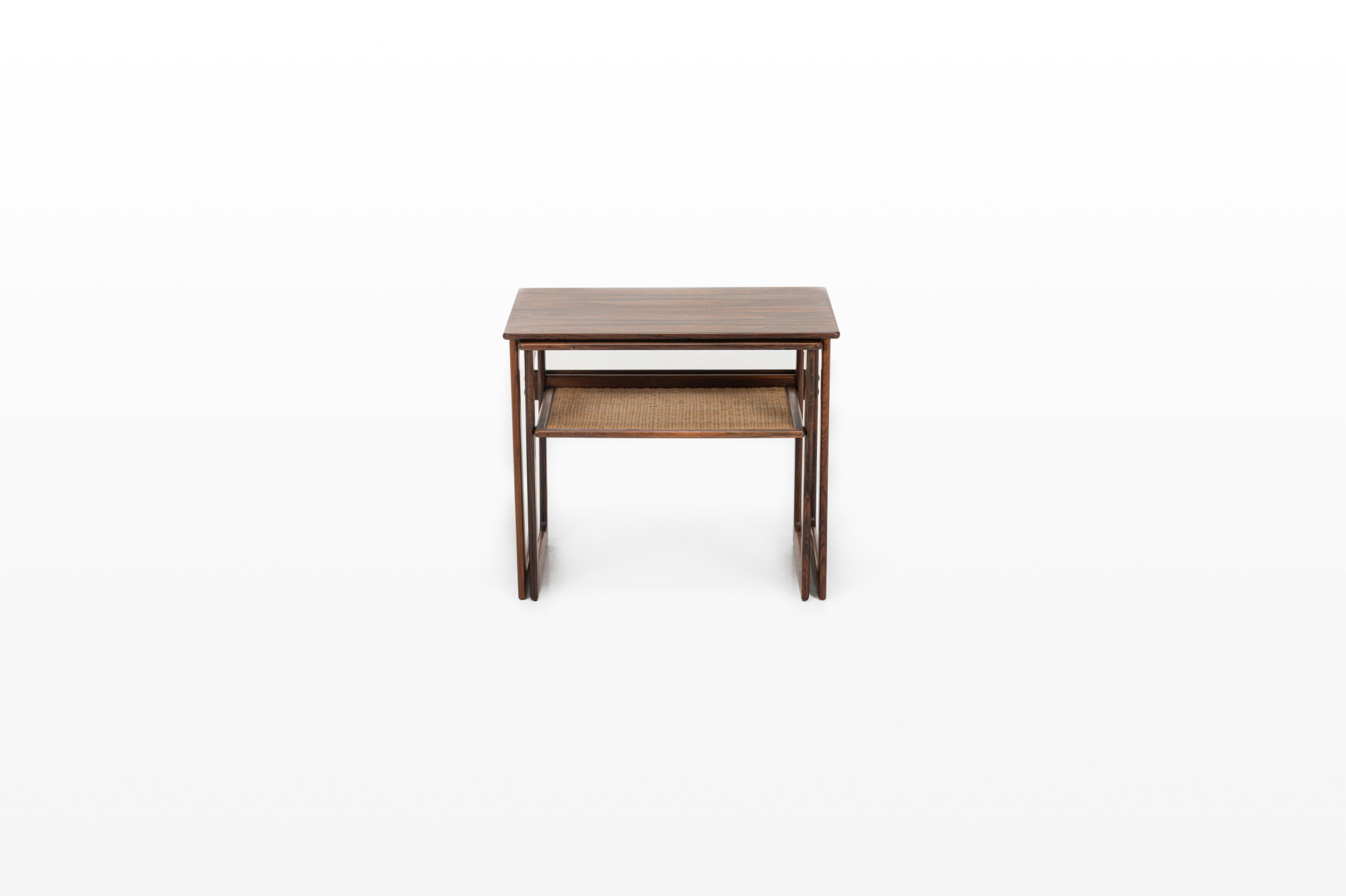 Two vintage nesting tables in rosewood and wicker. The tables were designed by Johannes Andersen and made by Silkeborg Mobelfabrik. They are in very good condition.