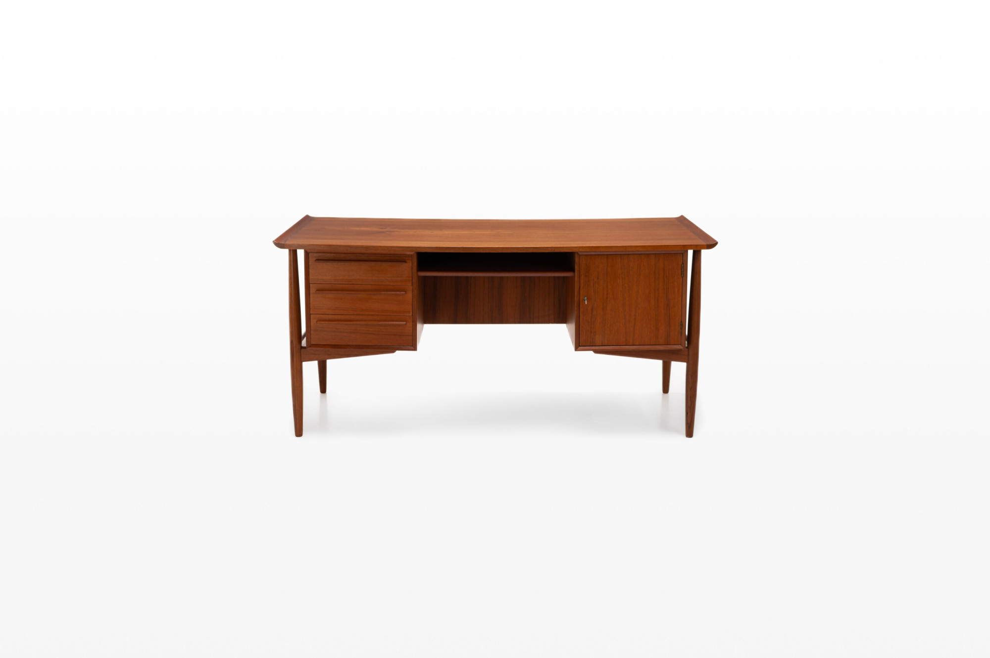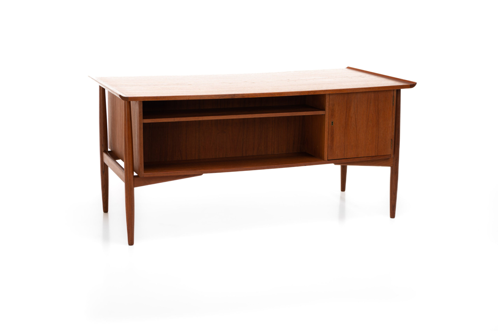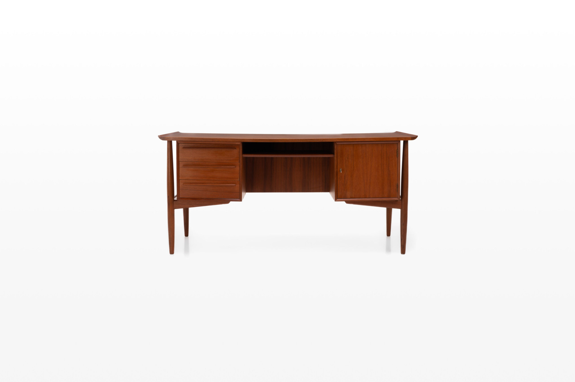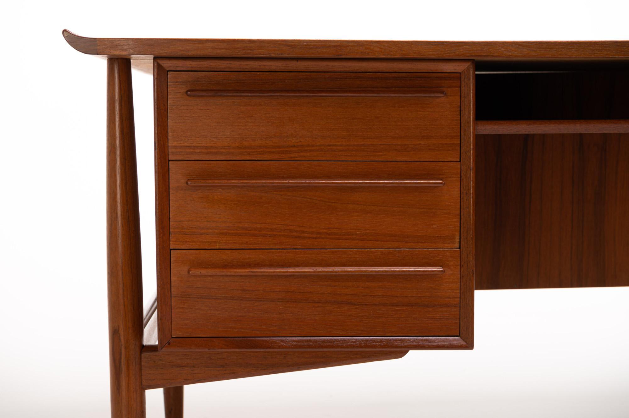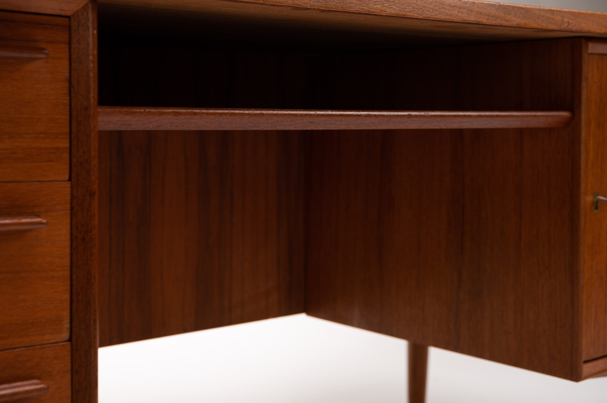 Beautiful Scandinavian vintage writing desk in teak designed by Arne Vodder for HP Hansen. There are three drawers and a lot of storage space. The desk is in very good restored condition. A real eye catcher for your interior. The sticker from the producer is still present.