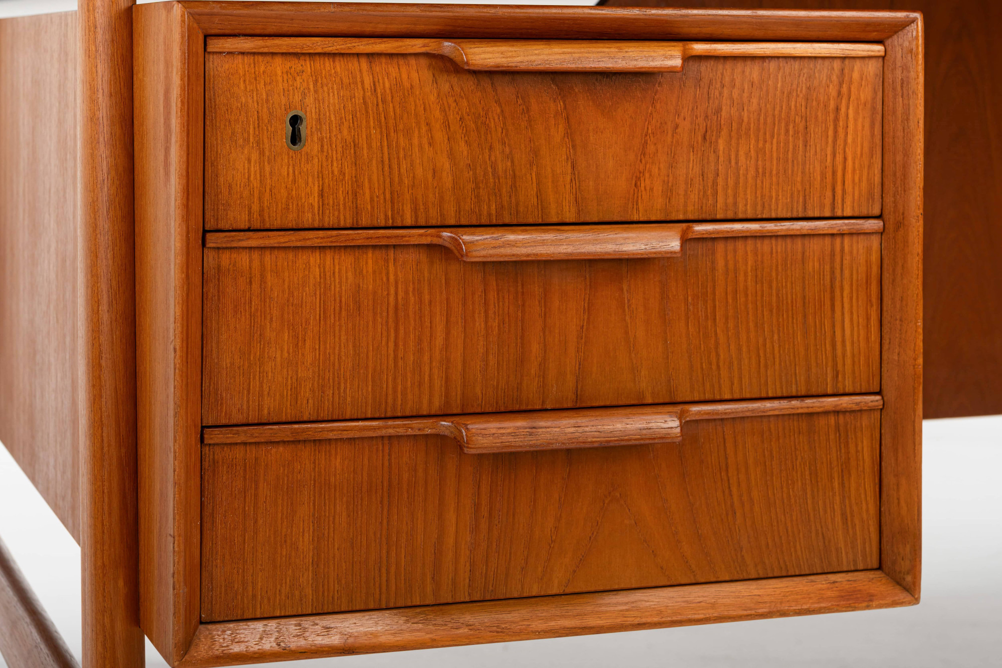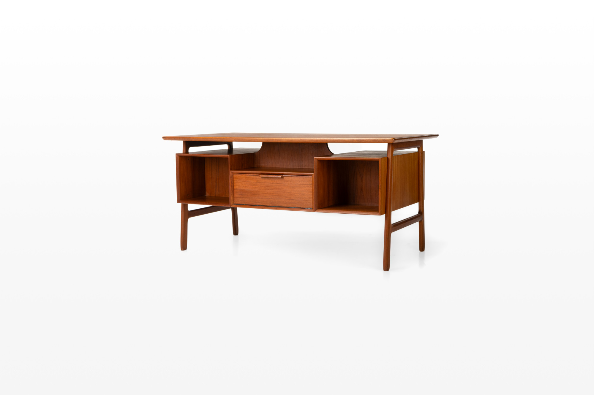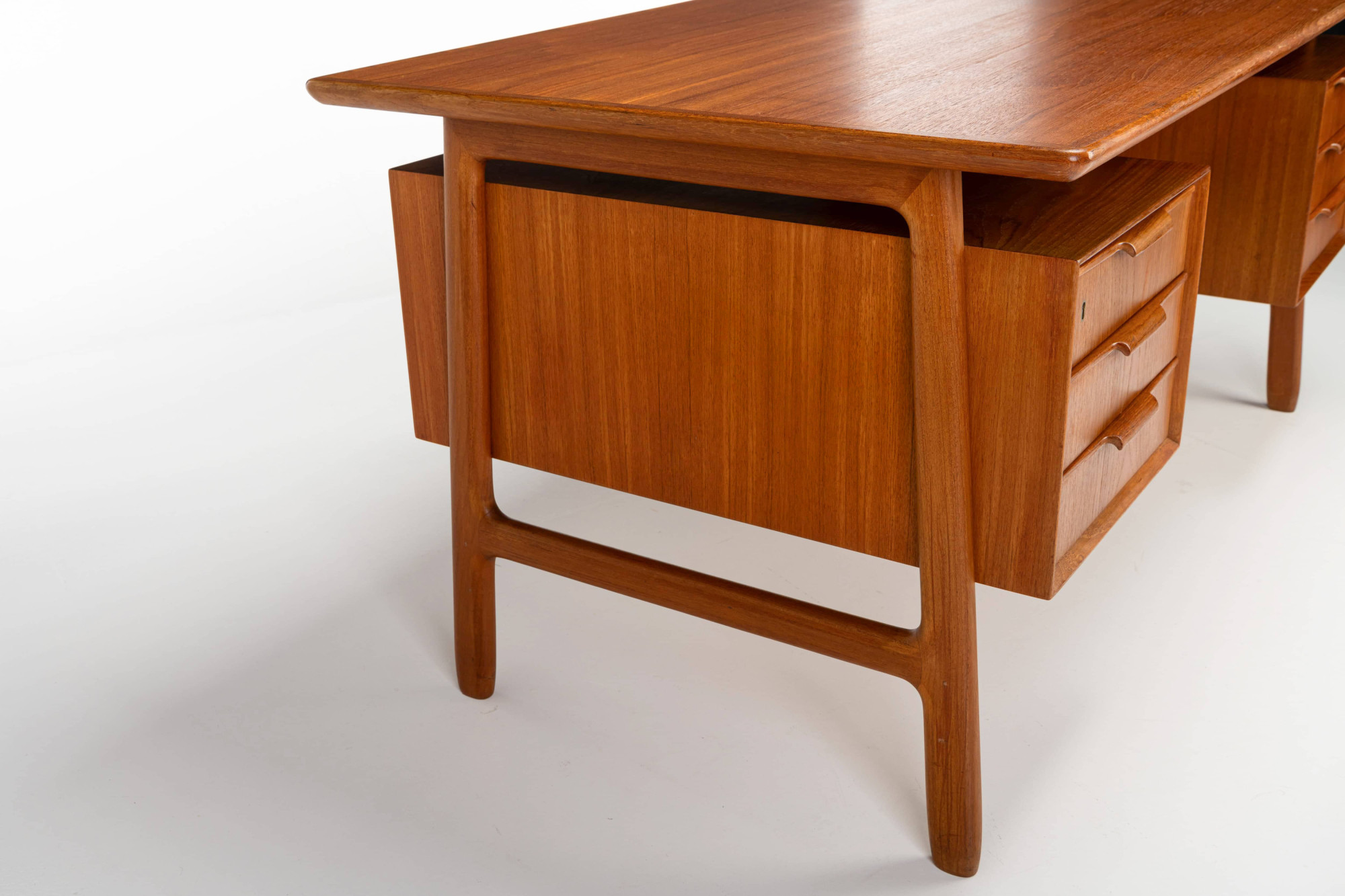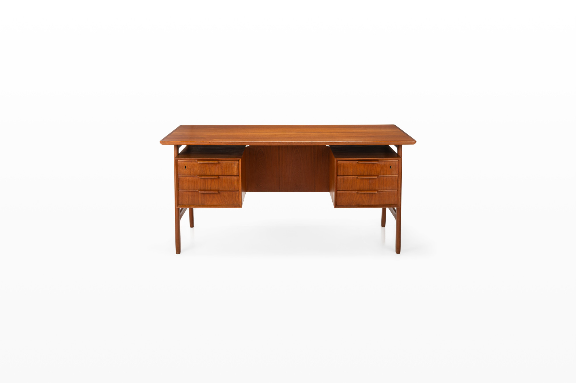 This beautiful teak desk was designed for Omann Jun Møbelfabrik in Denmark, model 75. The freestanding desk has a floating desktop. It has six drawers and is in very good condition. The key is still present.