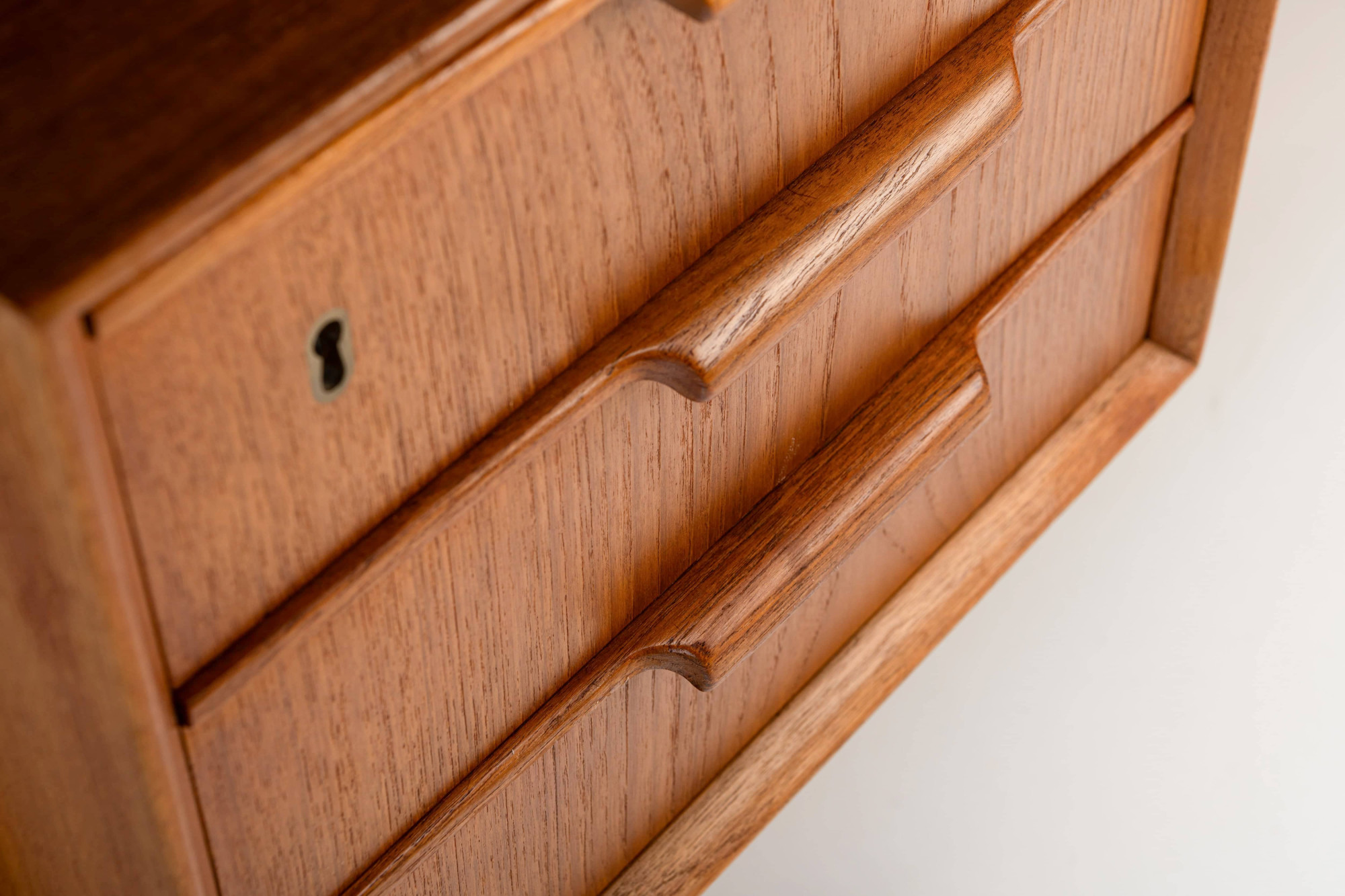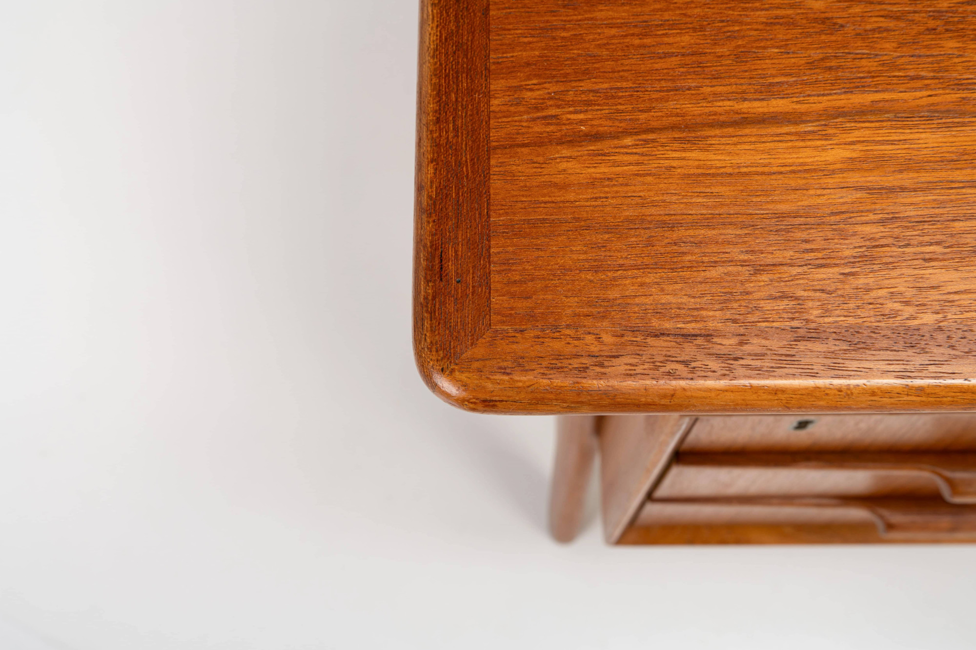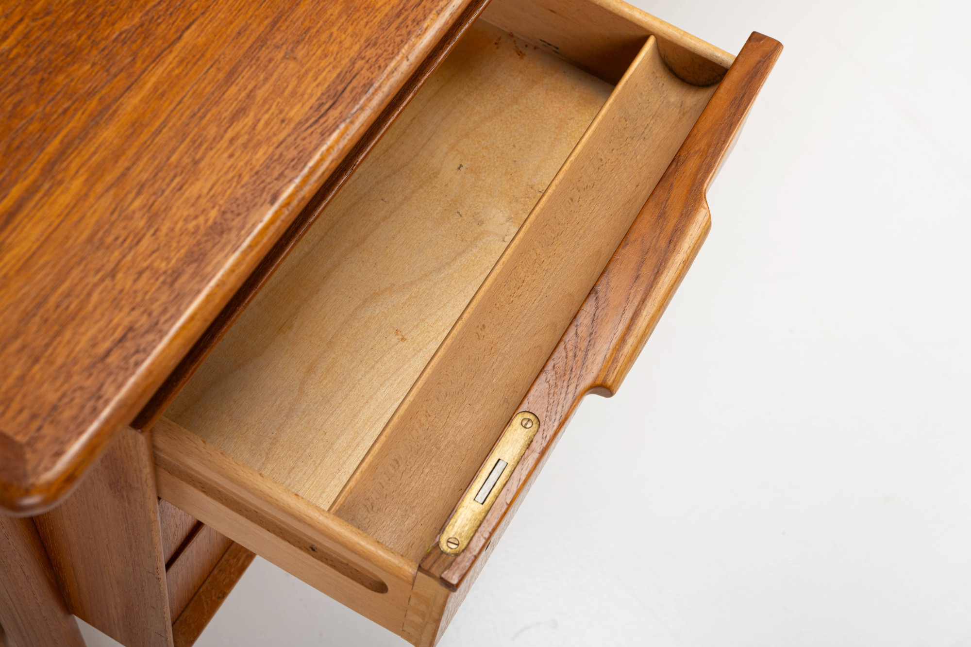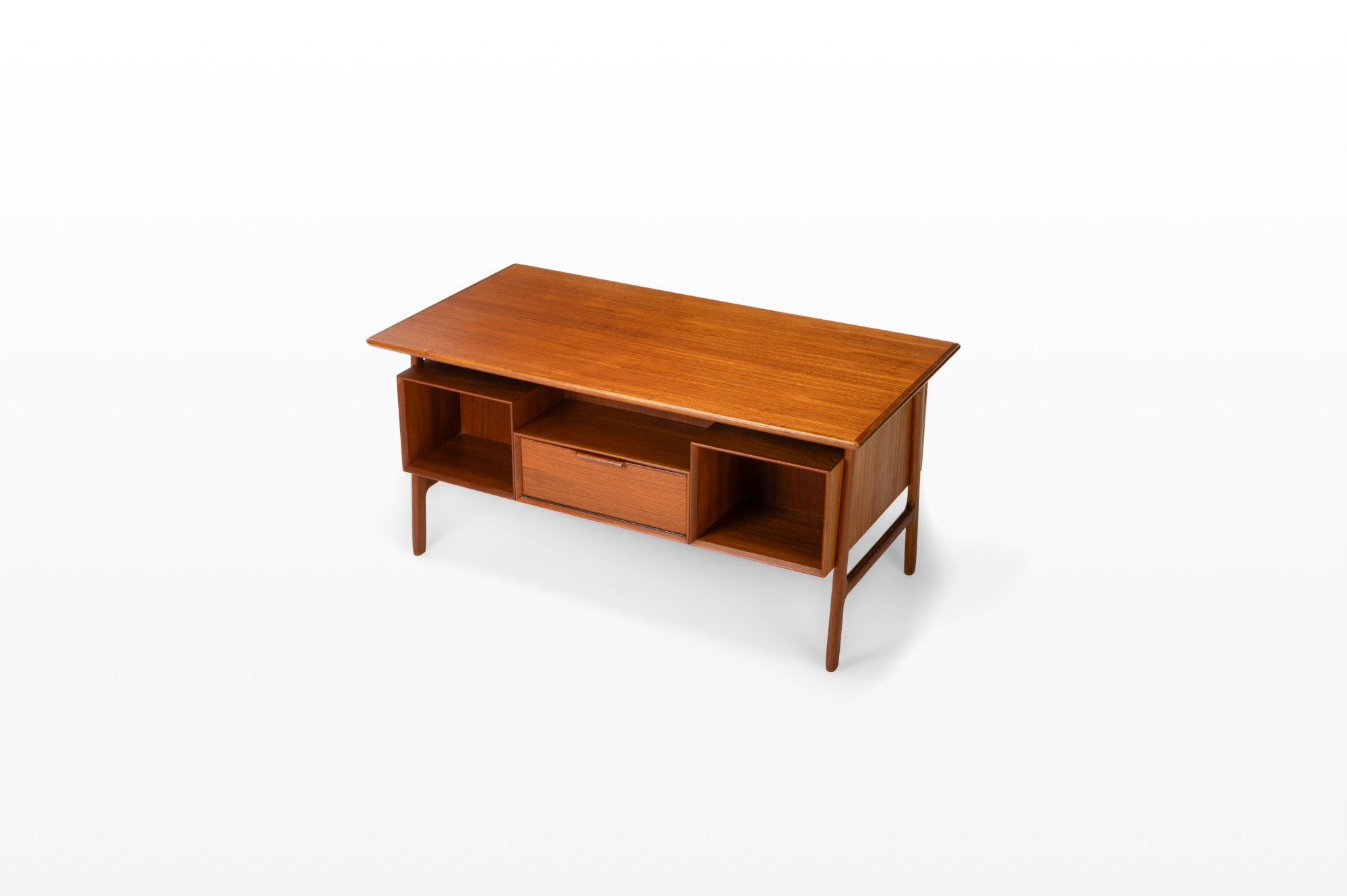 This beautiful teak desk was designed for Omann Jun Møbelfabrik in Denmark, model 75. The freestanding desk has a floating desktop. It has six drawers and is in very good condition. The key is still present.