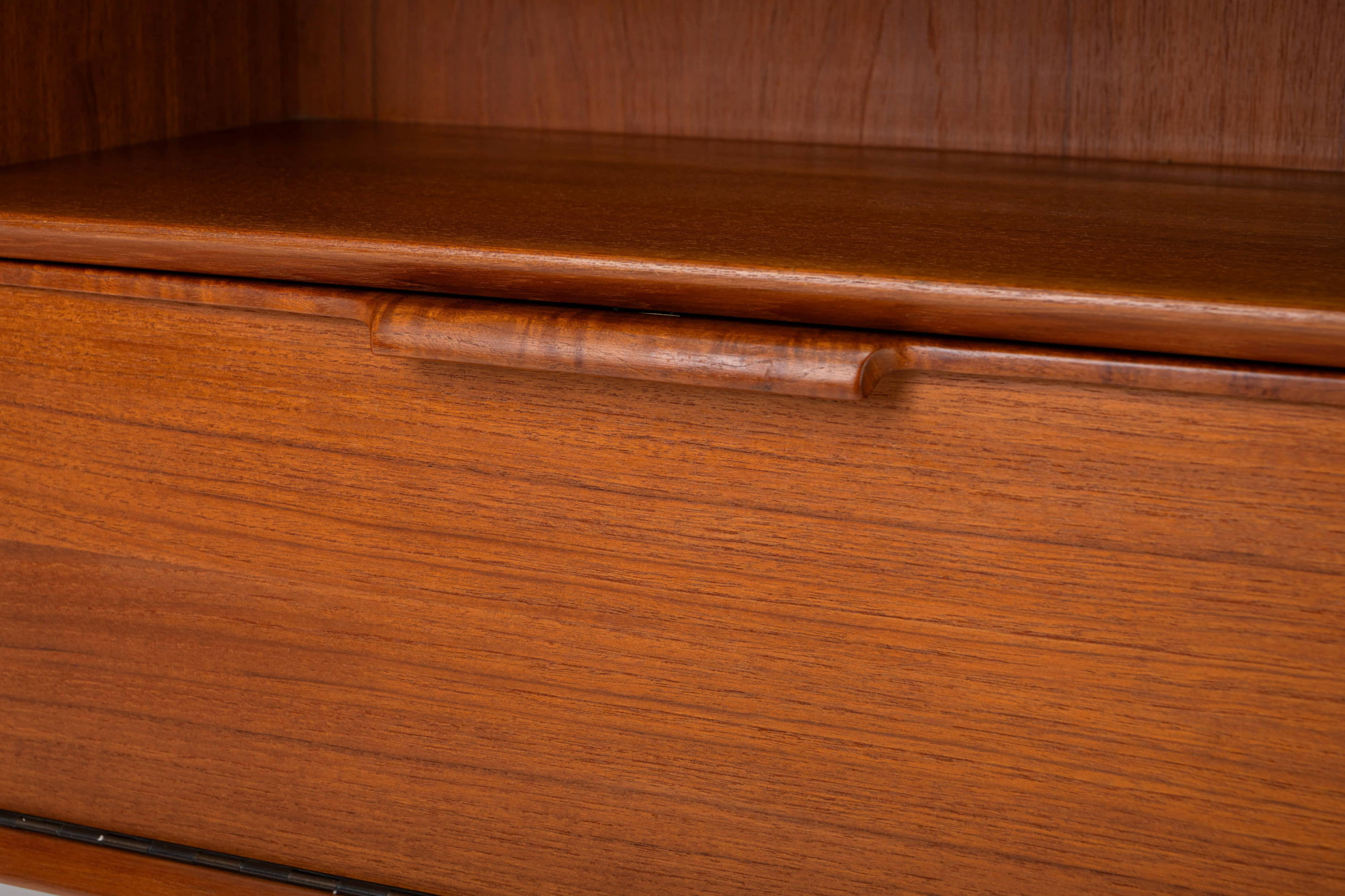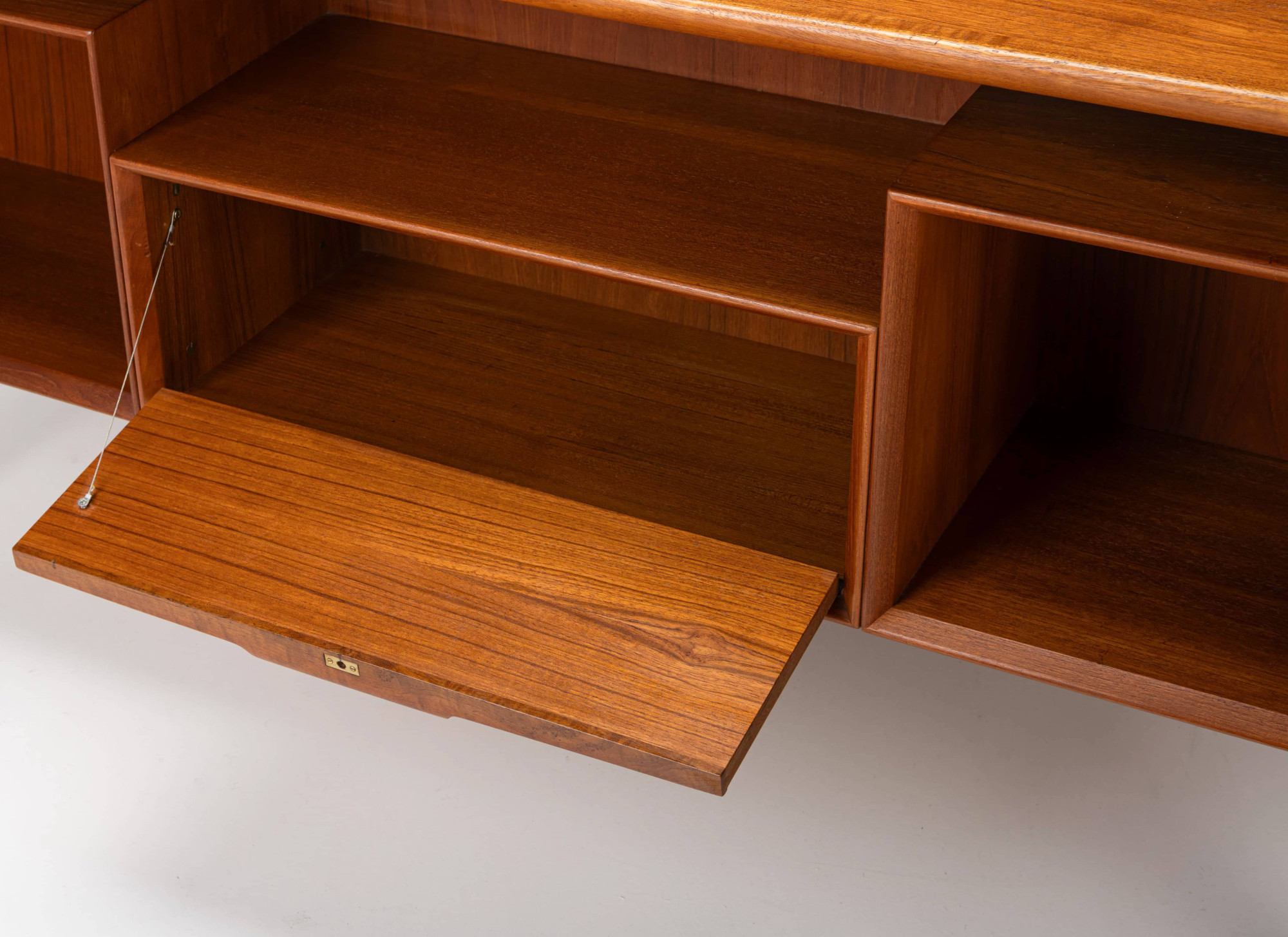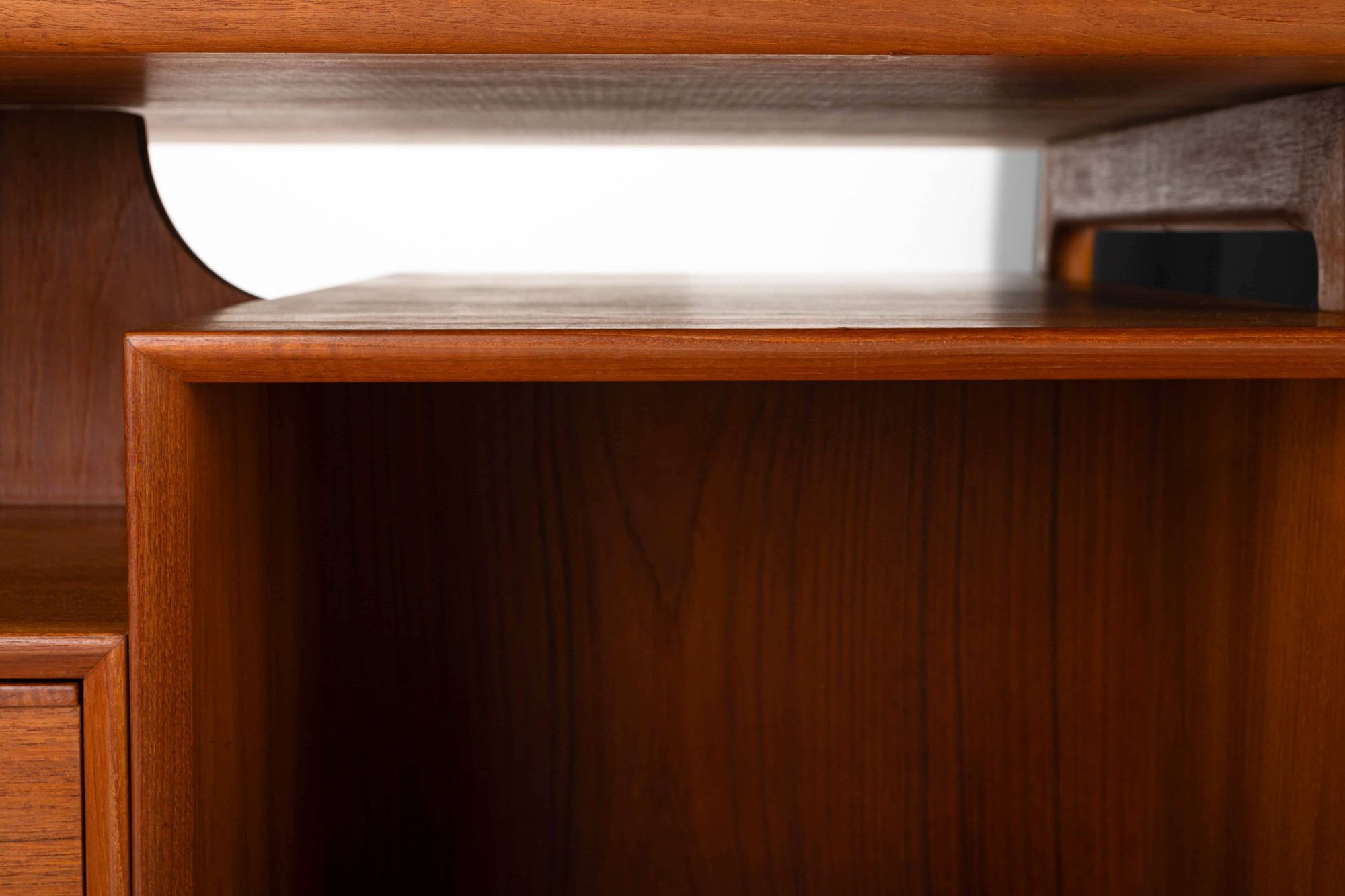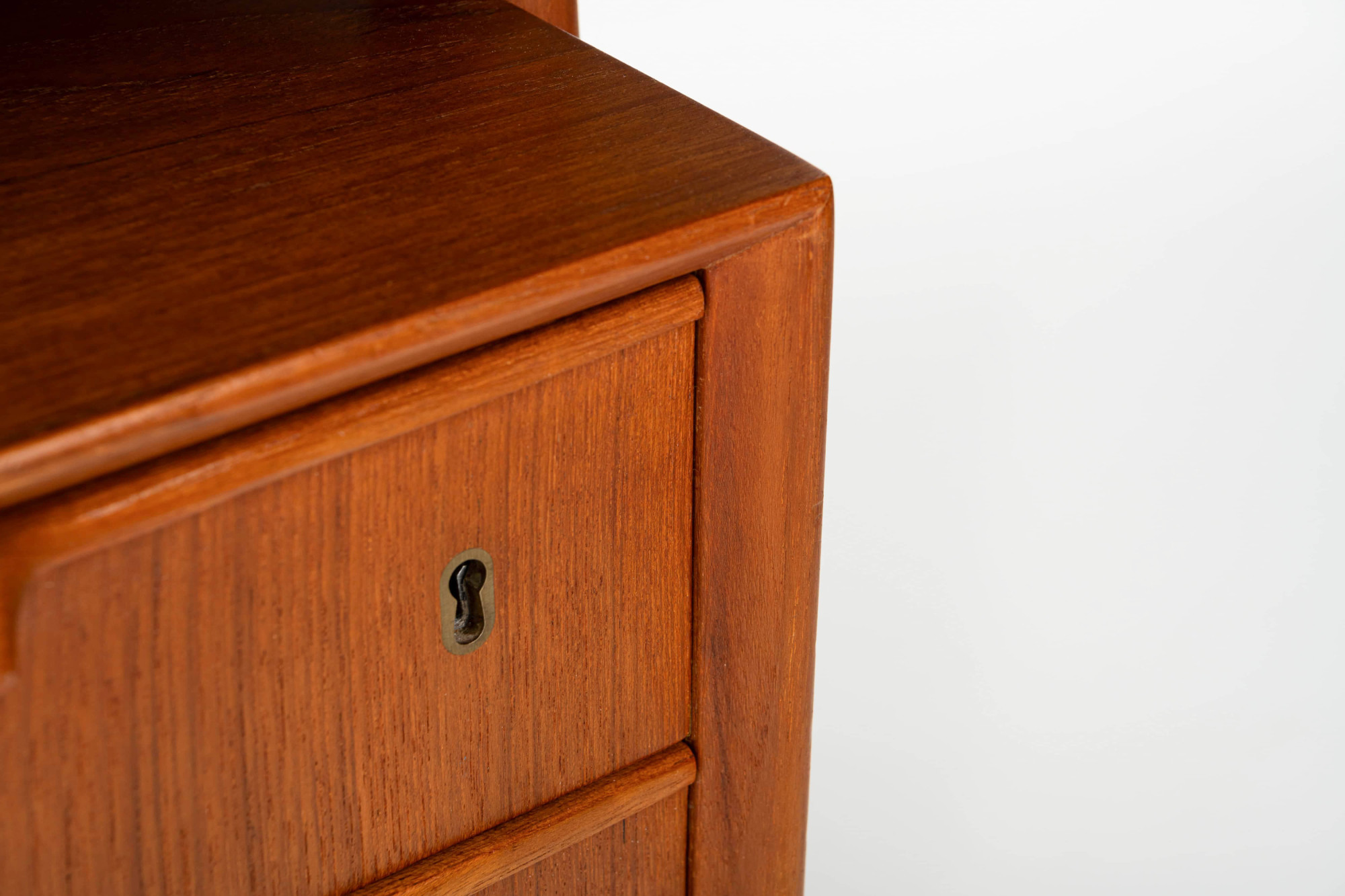 This beautiful teak desk was designed for Omann Jun Møbelfabrik in Denmark, model 75. The freestanding desk has a floating desktop. It has six drawers and is in very good condition. The key is still present.