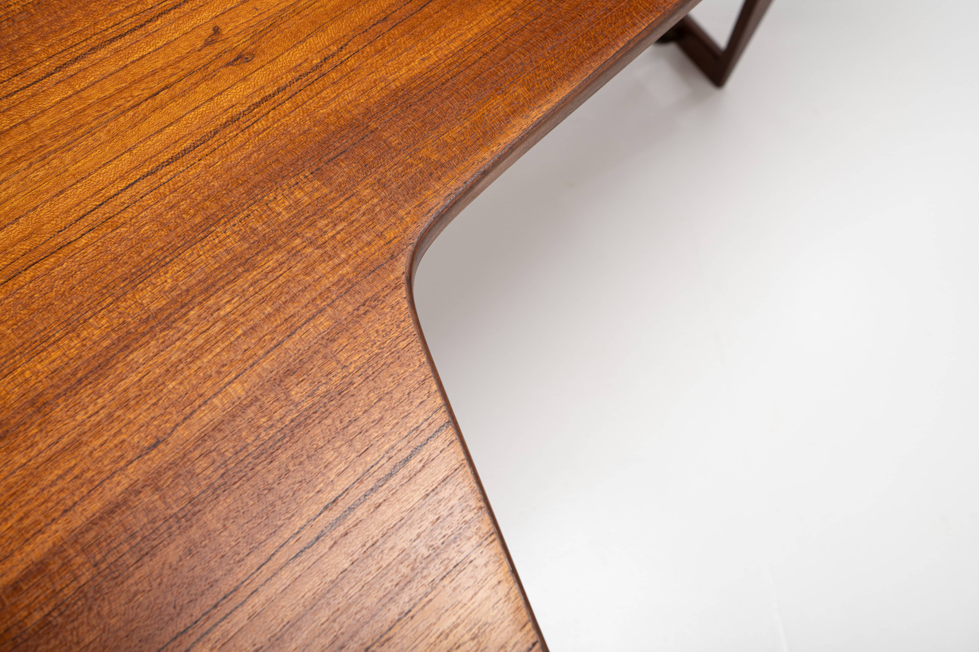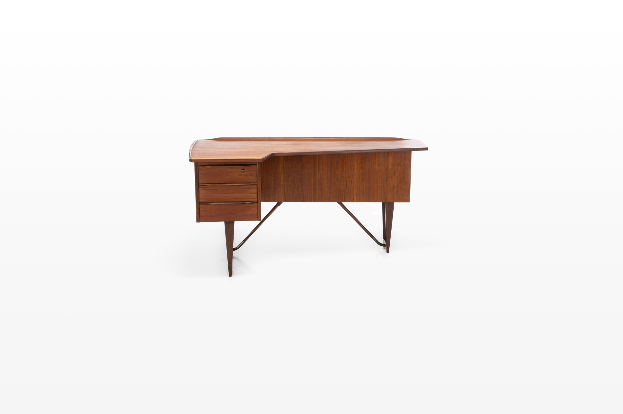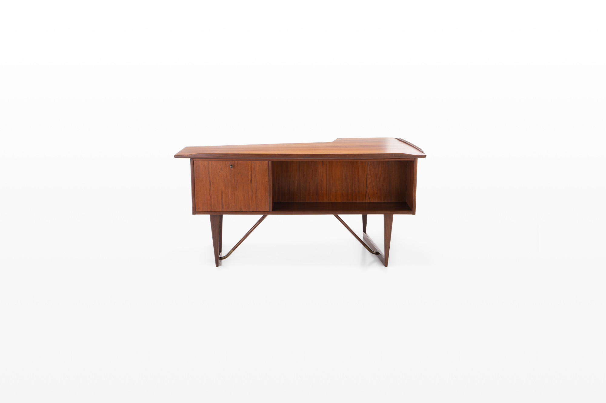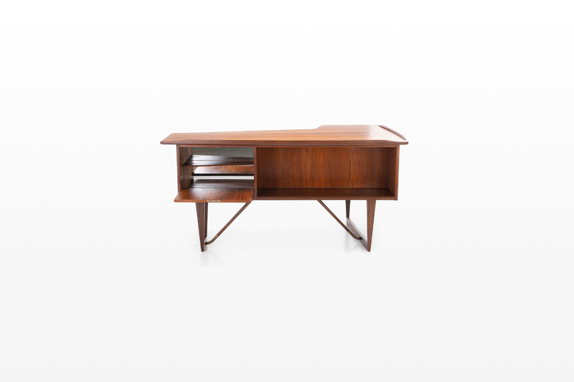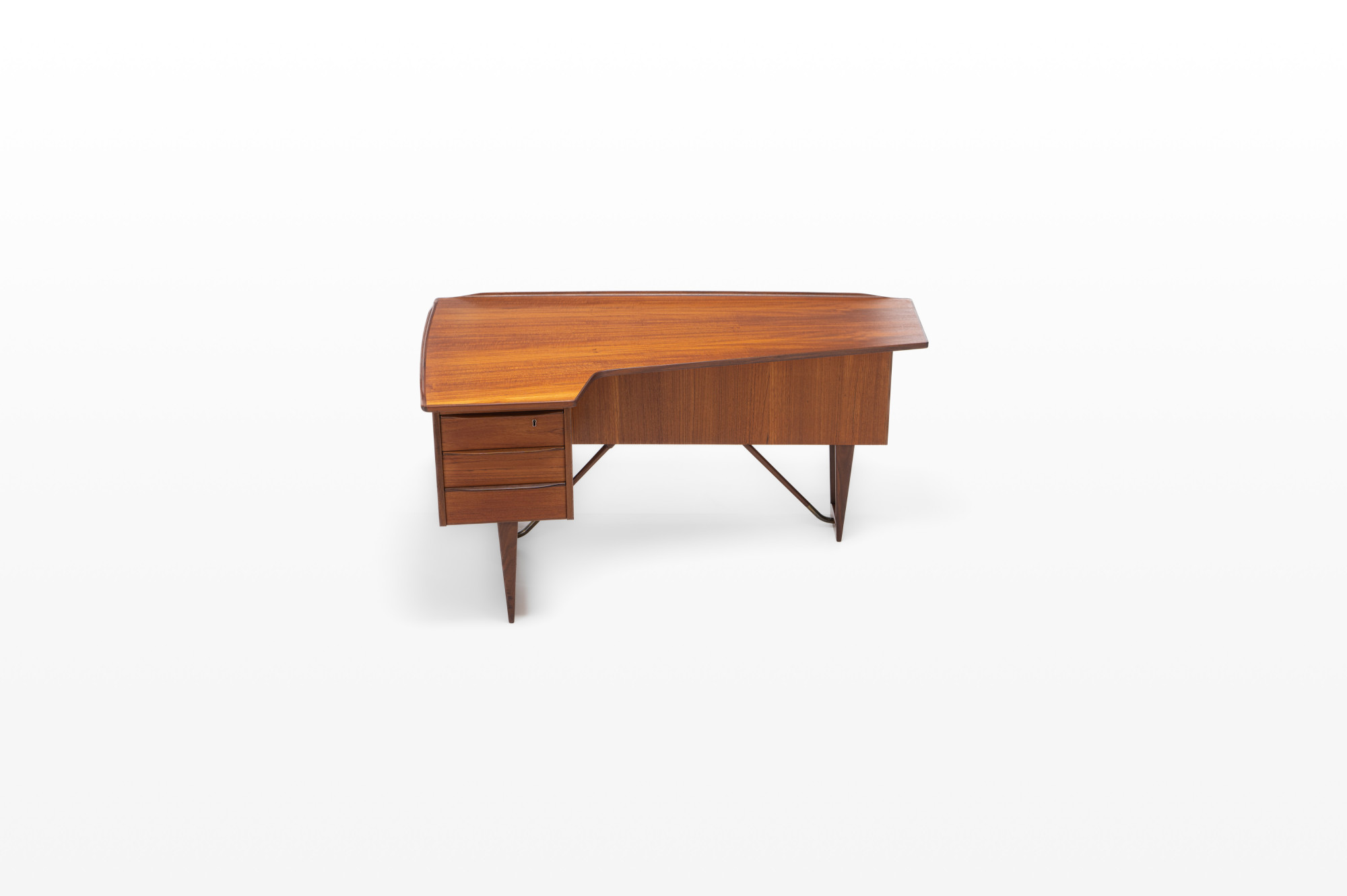 Beautiful vintage ‘Boomerang’ writing desk in teak designed by Peter Lovig Nielsen. There are three drawers, one bar area and a lot of storage space. This desk is in very good restored condition.