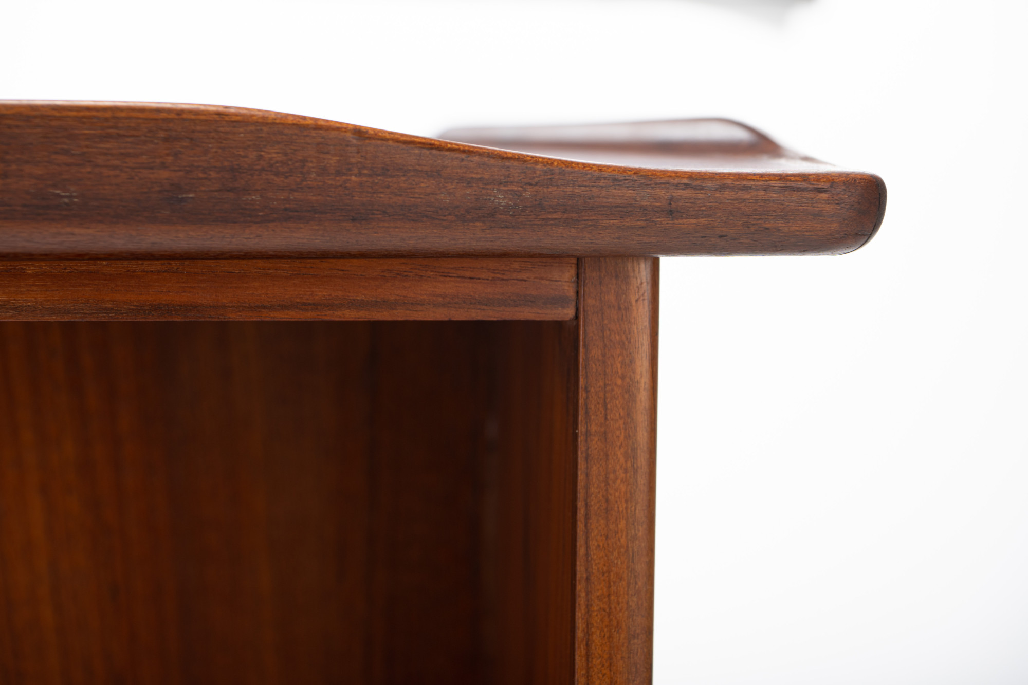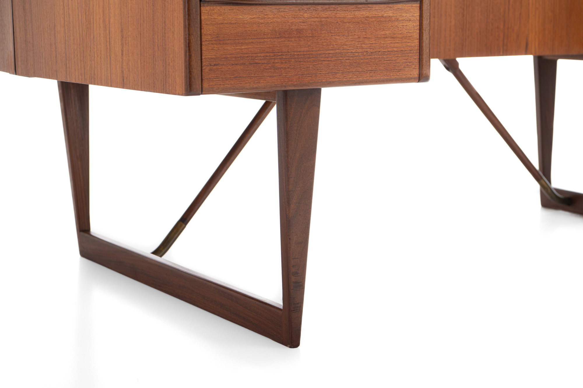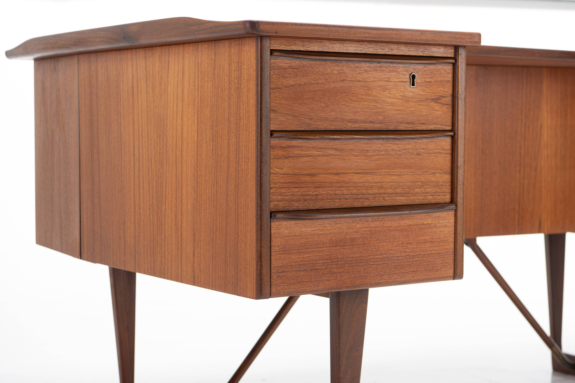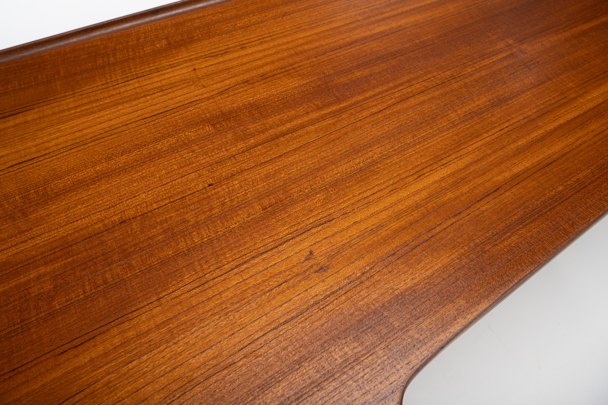 Beautiful vintage ‘Boomerang’ writing desk in teak designed by Peter Lovig Nielsen. There are three drawers, one bar area and a lot of storage space. This desk is in very good restored condition.