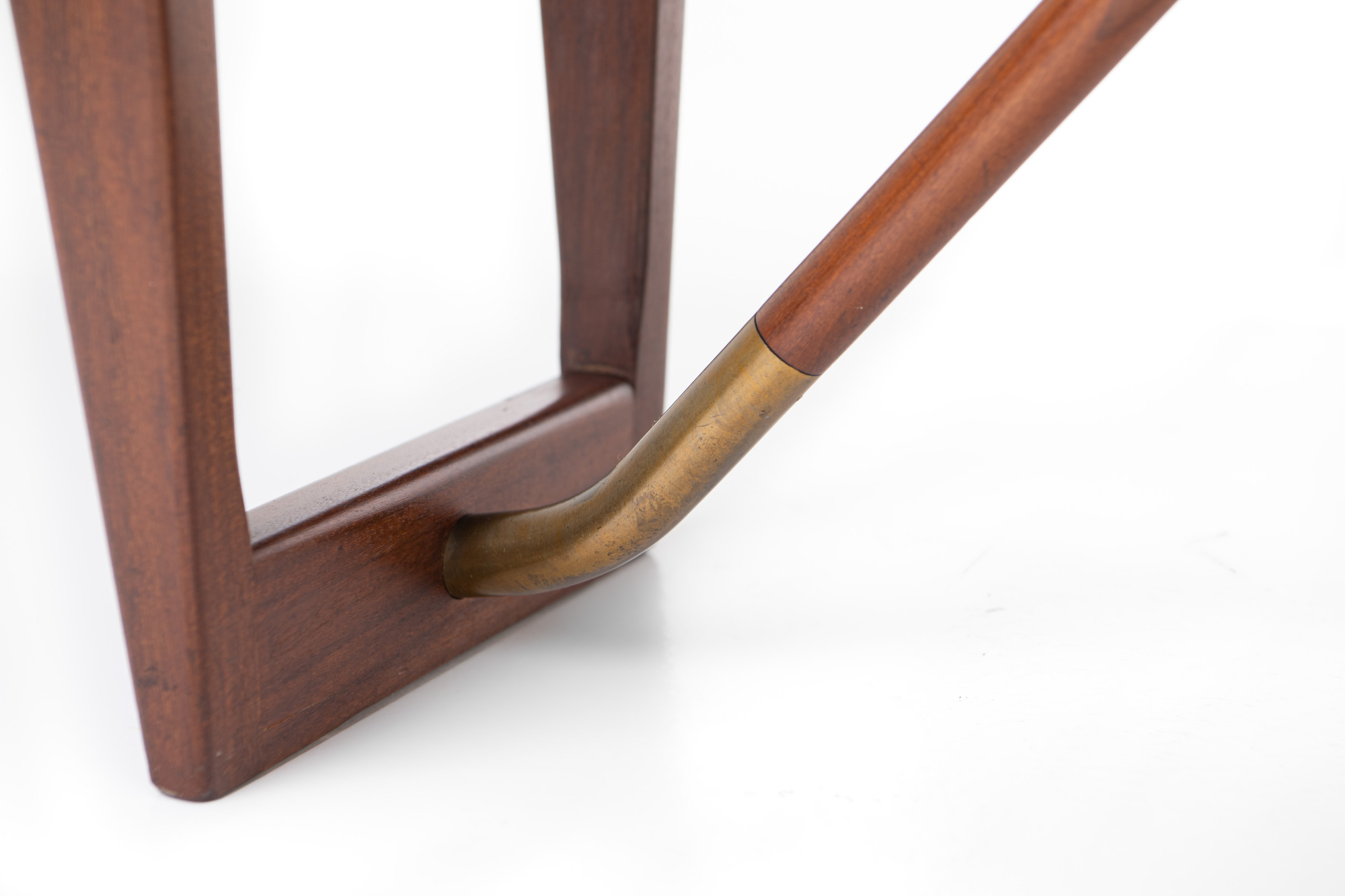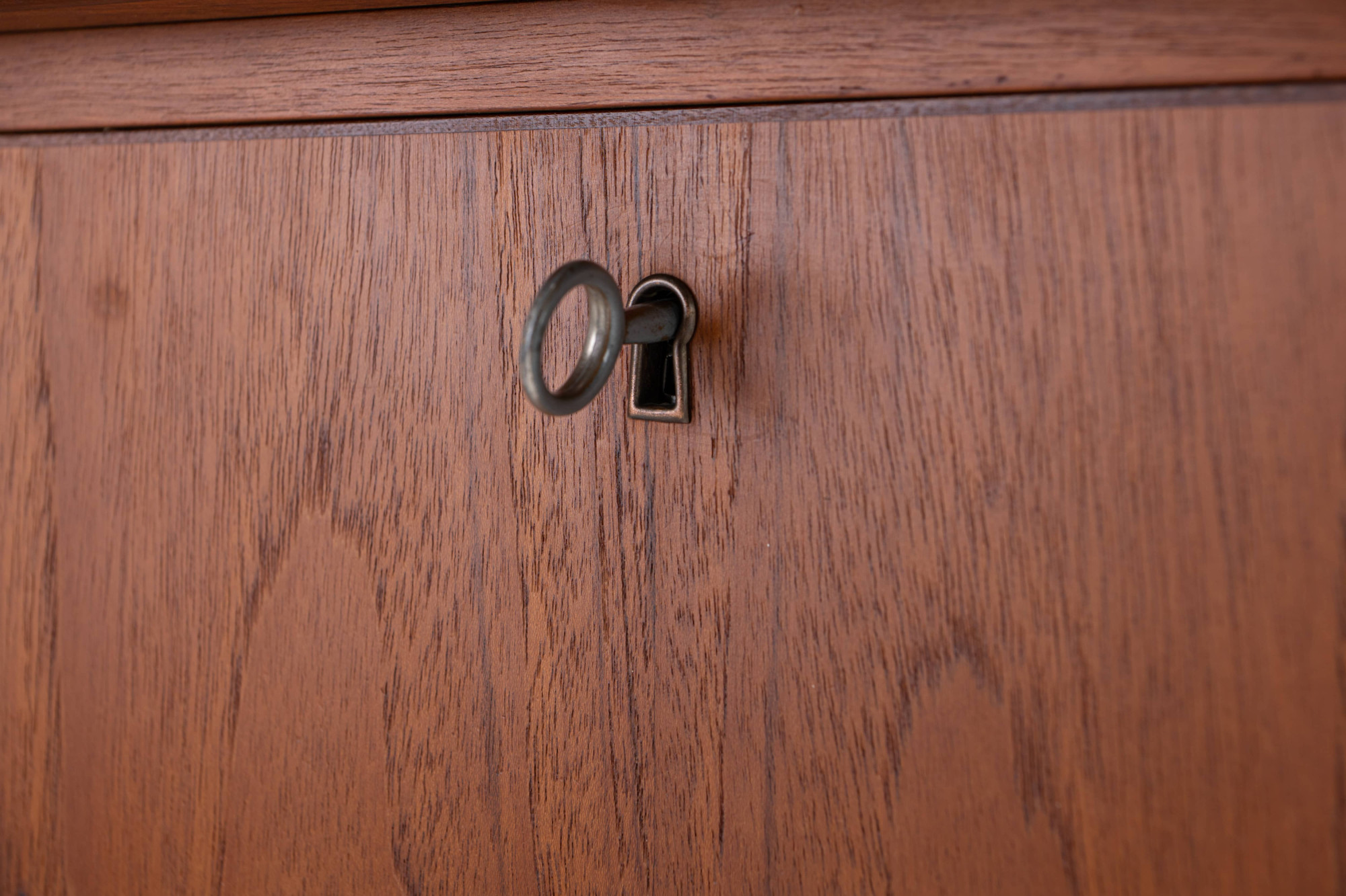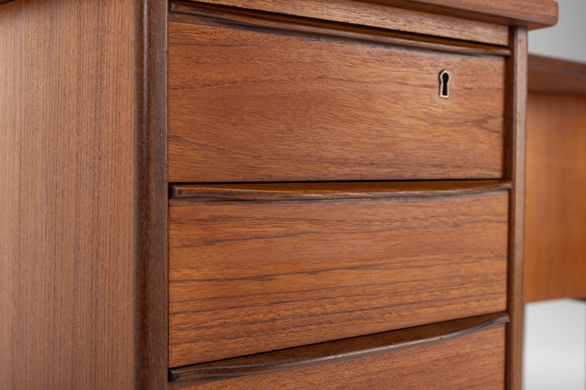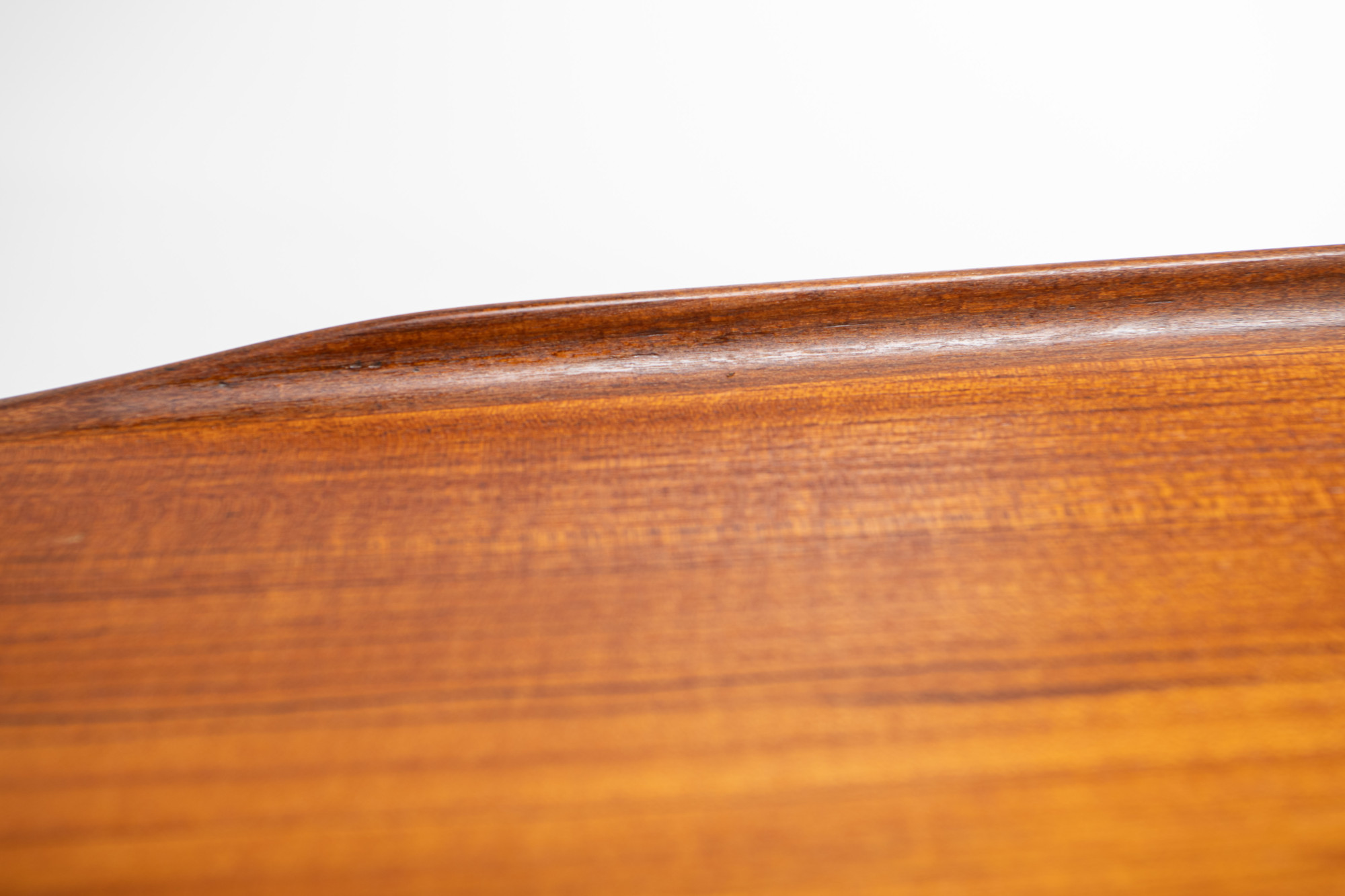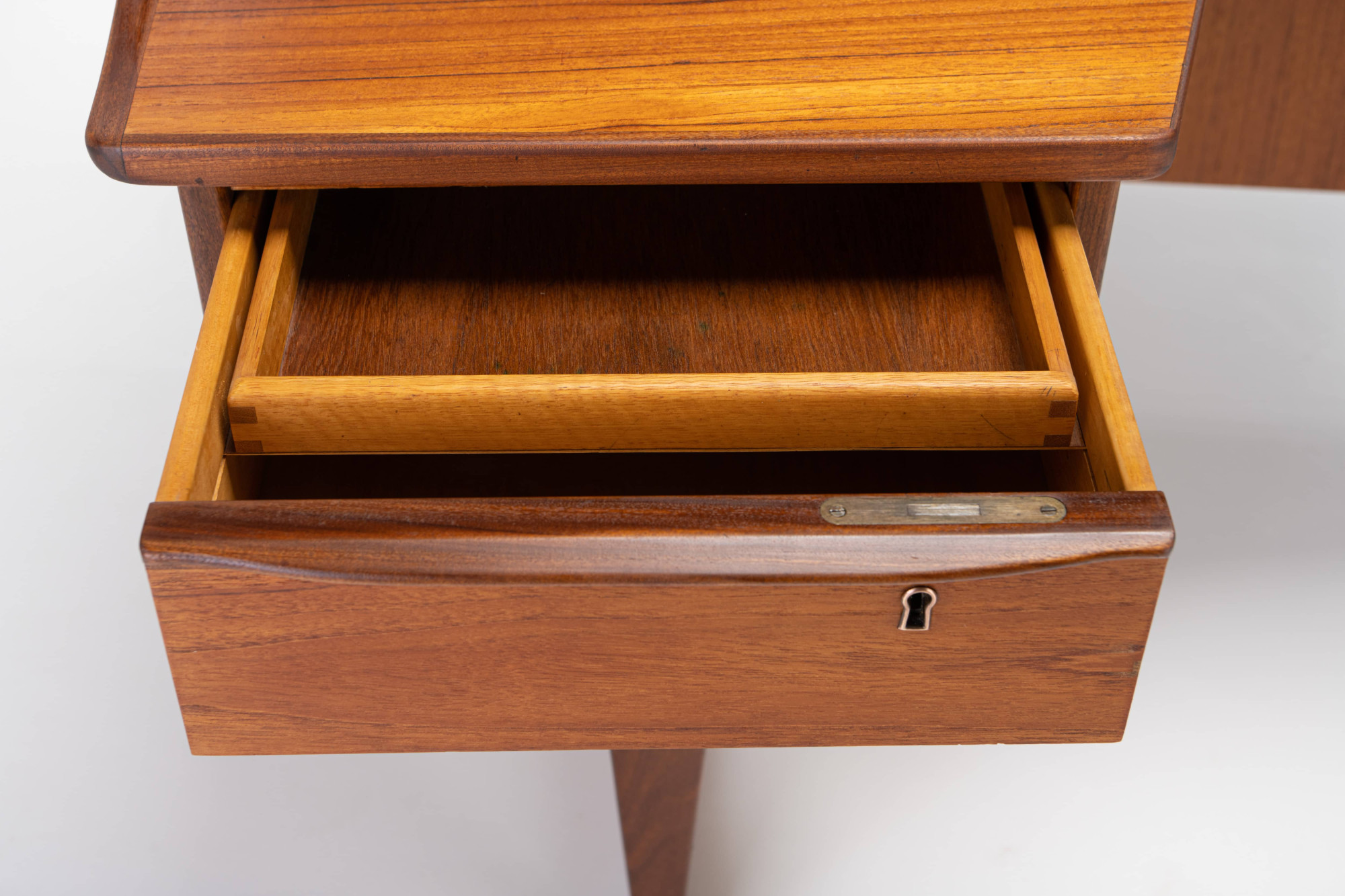 Beautiful vintage ‘Boomerang’ writing desk in teak designed by Peter Lovig Nielsen. There are three drawers, one bar area and a lot of storage space. This desk is in very good restored condition.