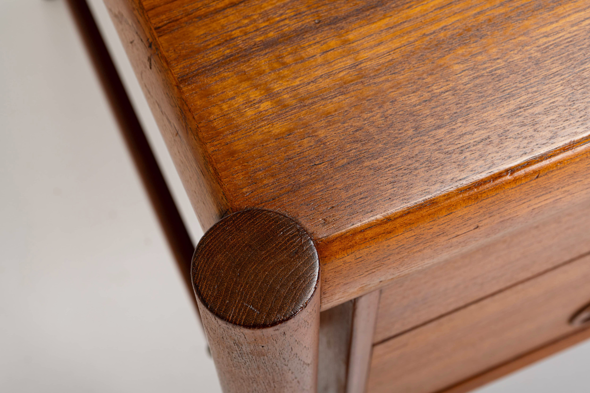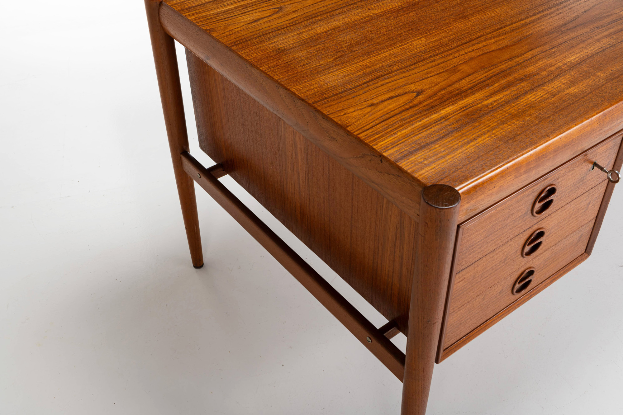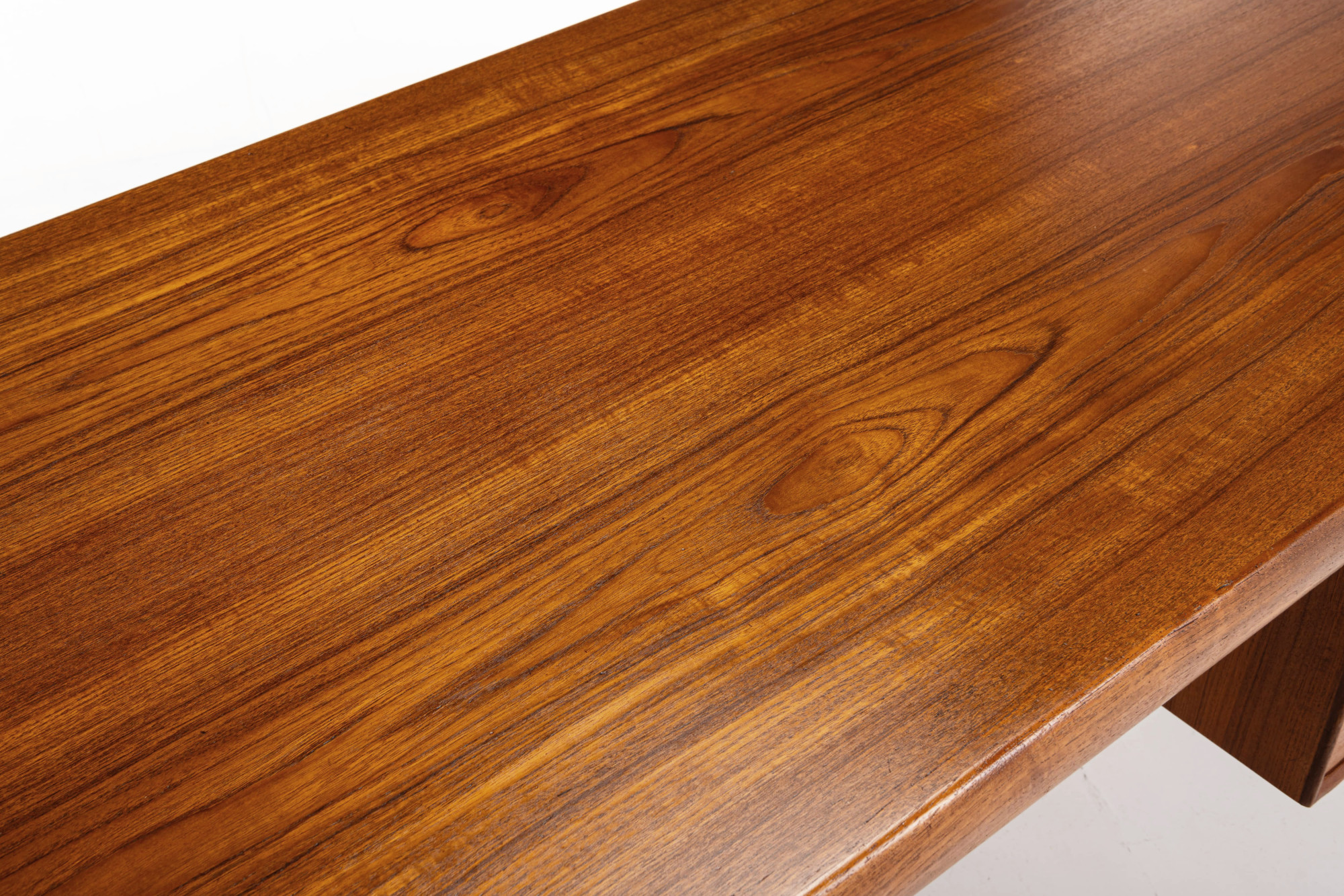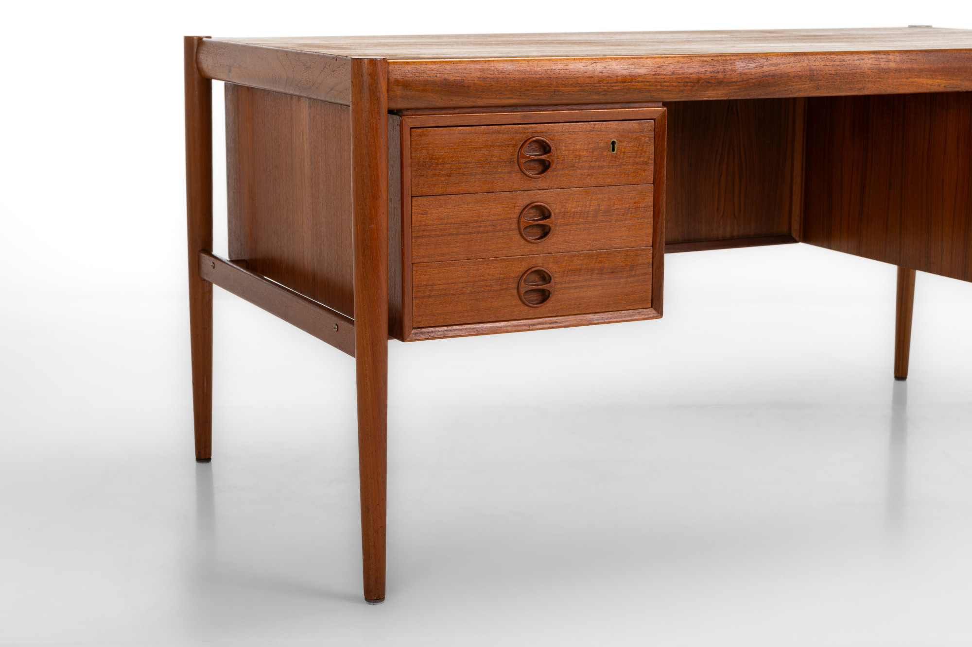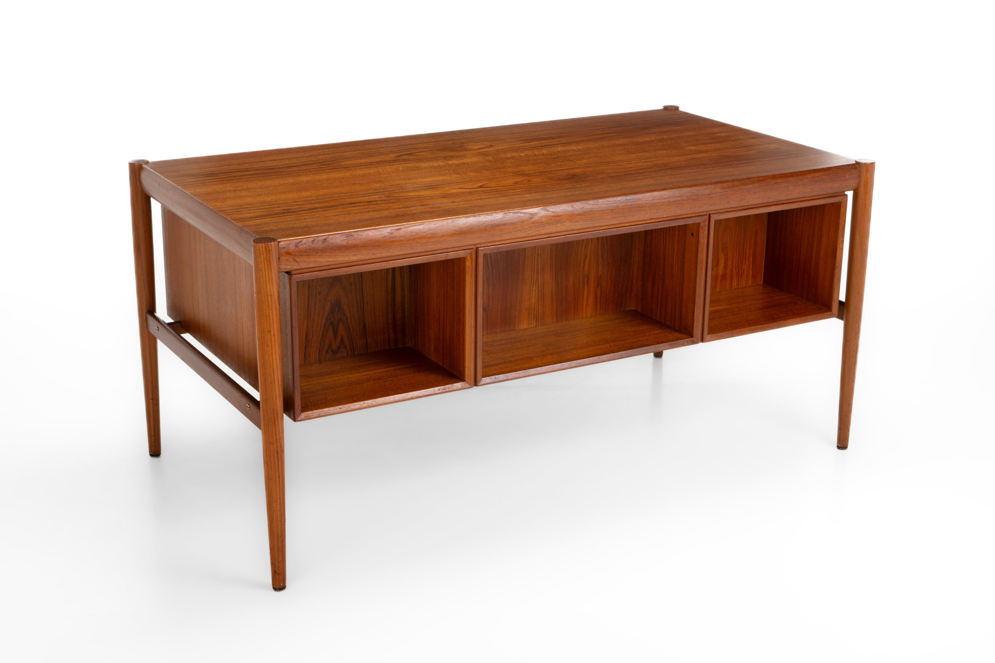 This stunning vintage writing desk, designed by Harry Østergaard for Randers Møbelfabrik in 1960s Denmark. Crafted from teak wood, it features beautifully designed legs and details. The desk has six drawers and additional open storage space at the back. It has been restored and is in excellent condition.