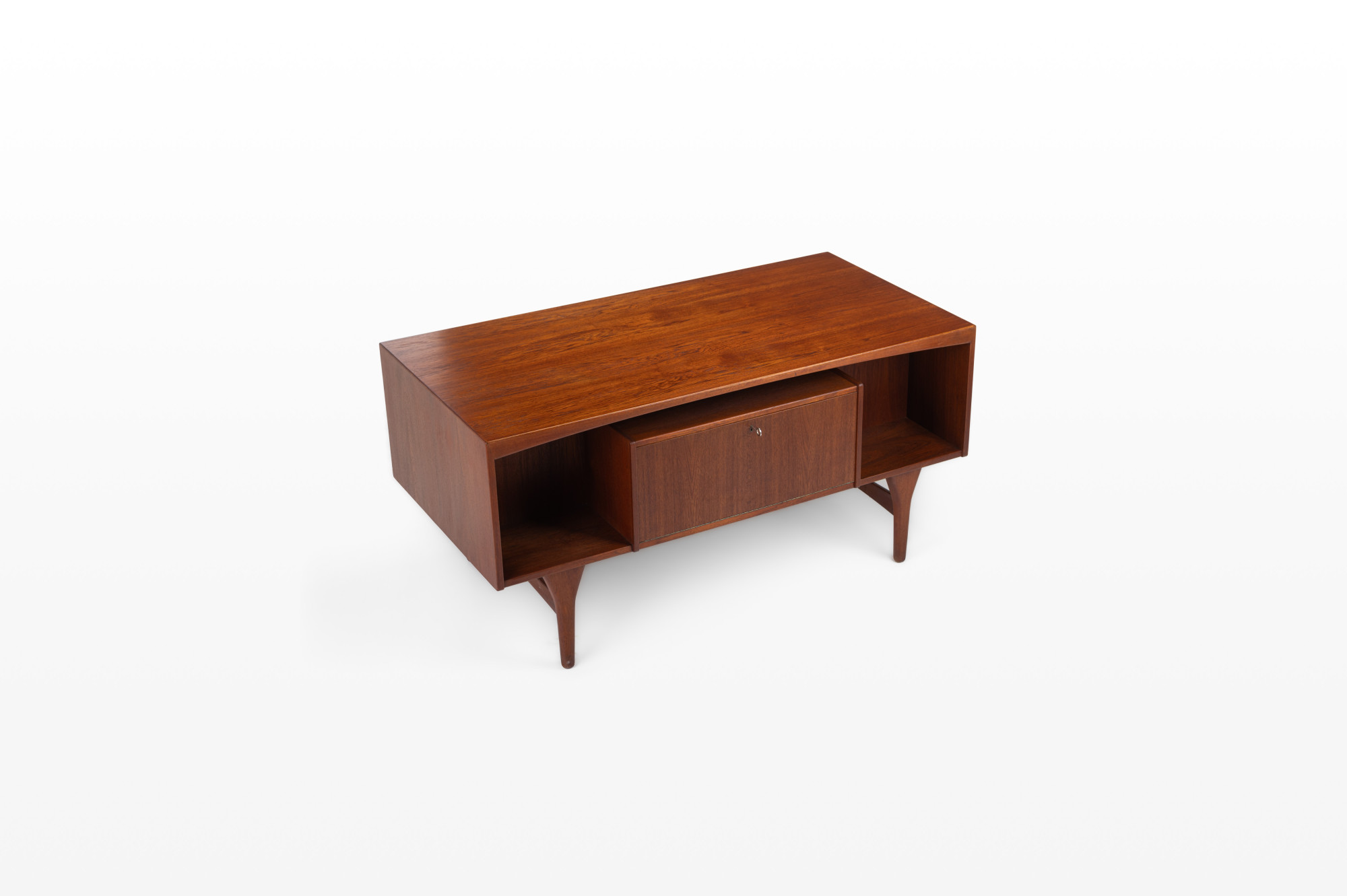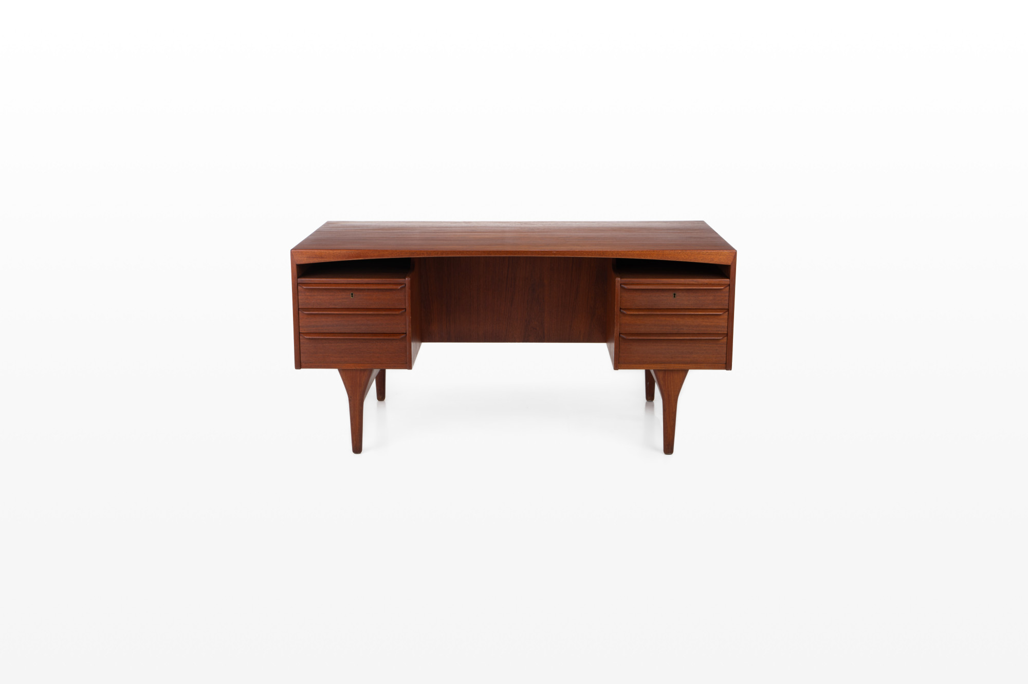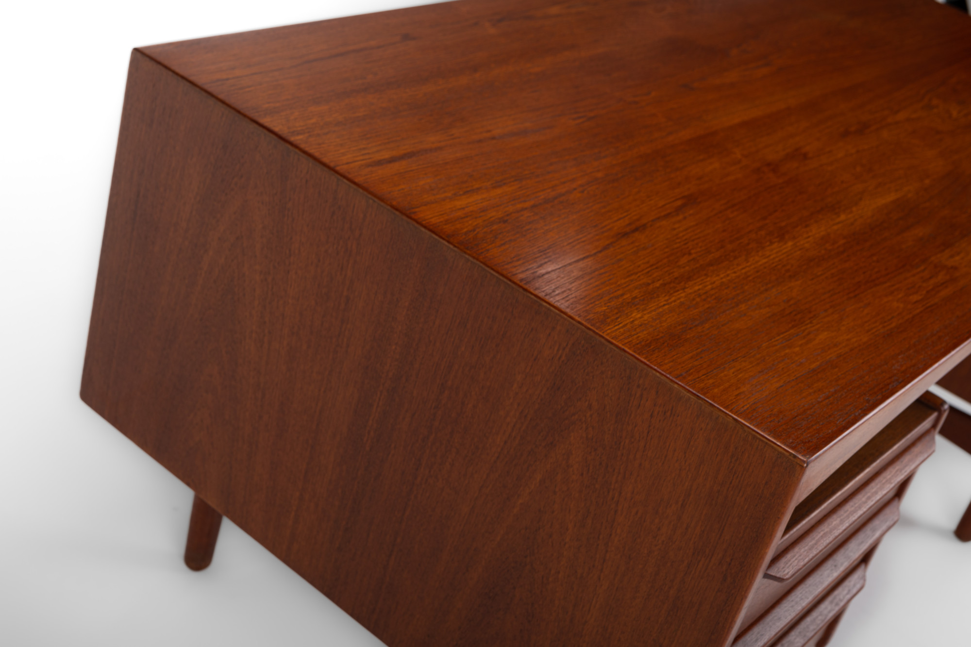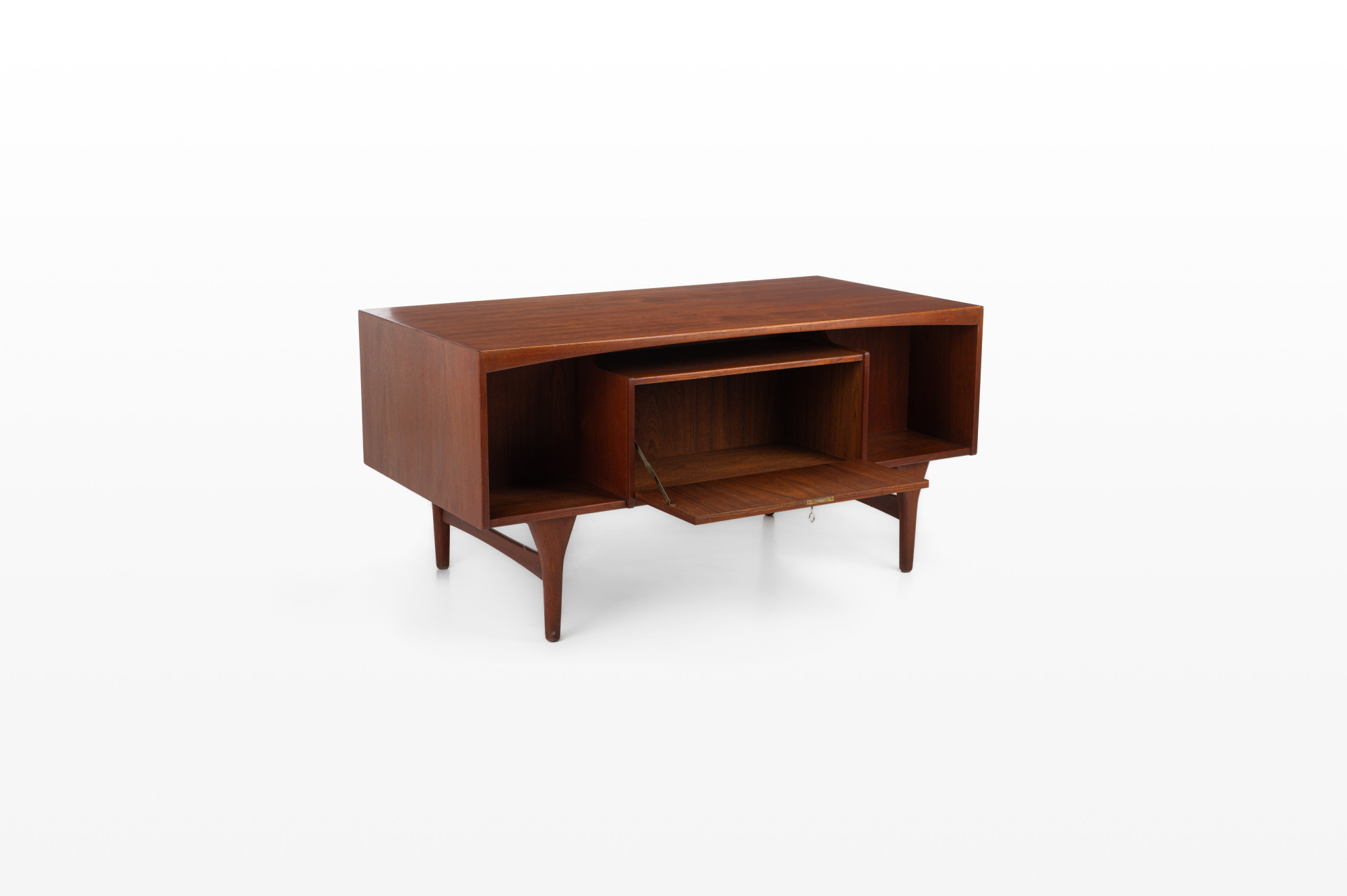 Beautiful vintage writing desk in teak produced by Valdemar Mortensen, Denmark 1960s. There are six drawers and a bar area. This desk is in very good restored condition and marked by the producer.