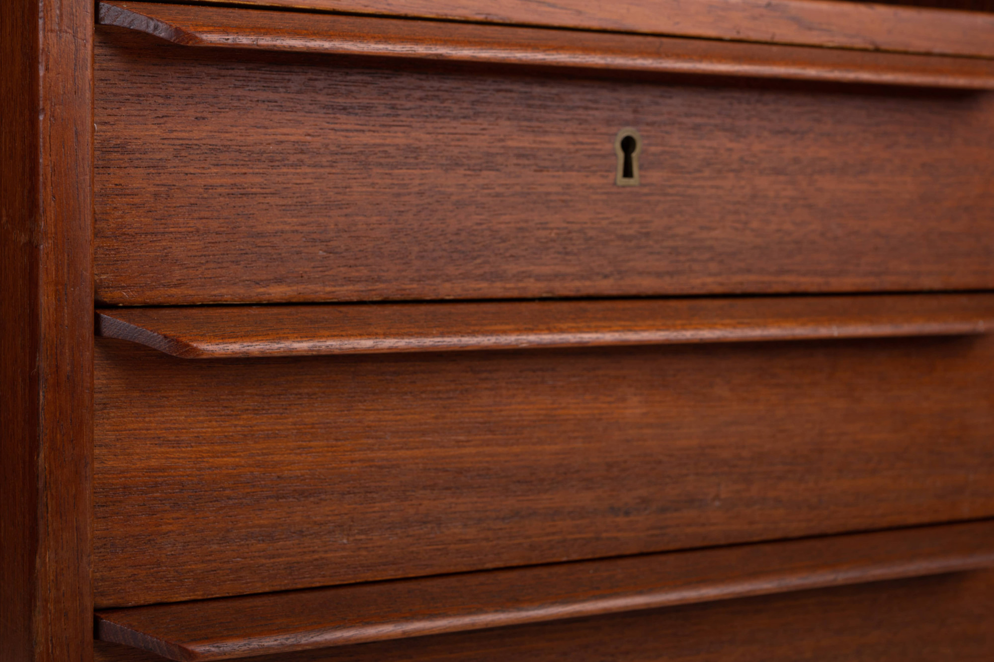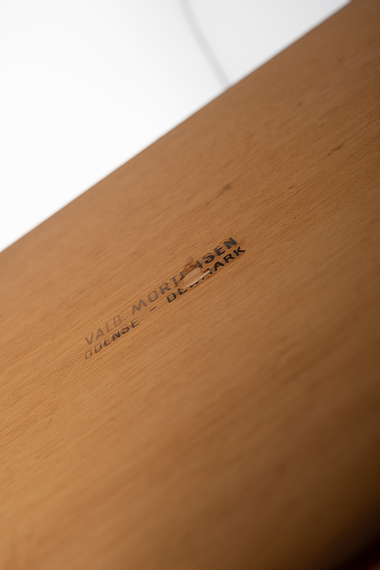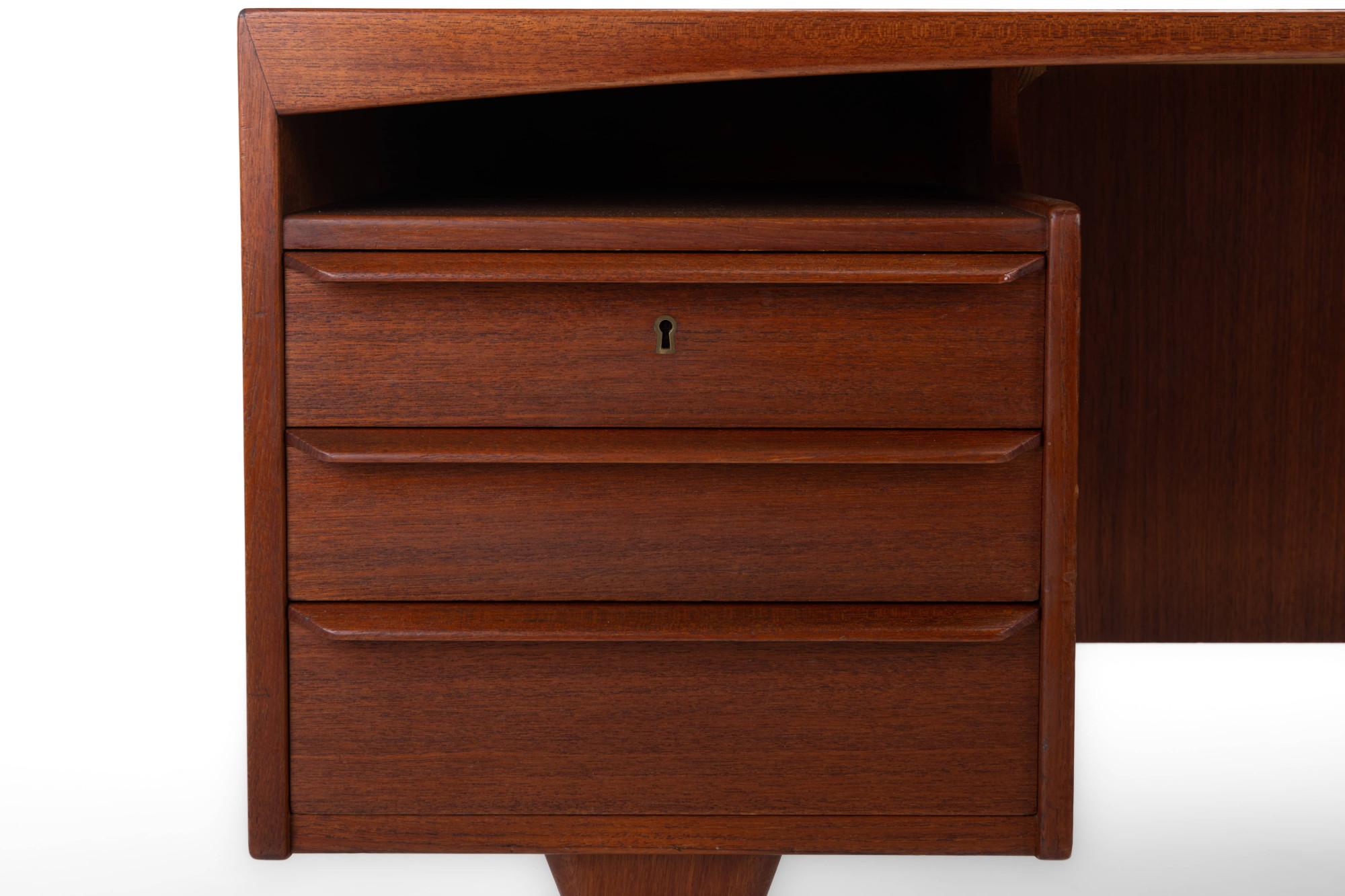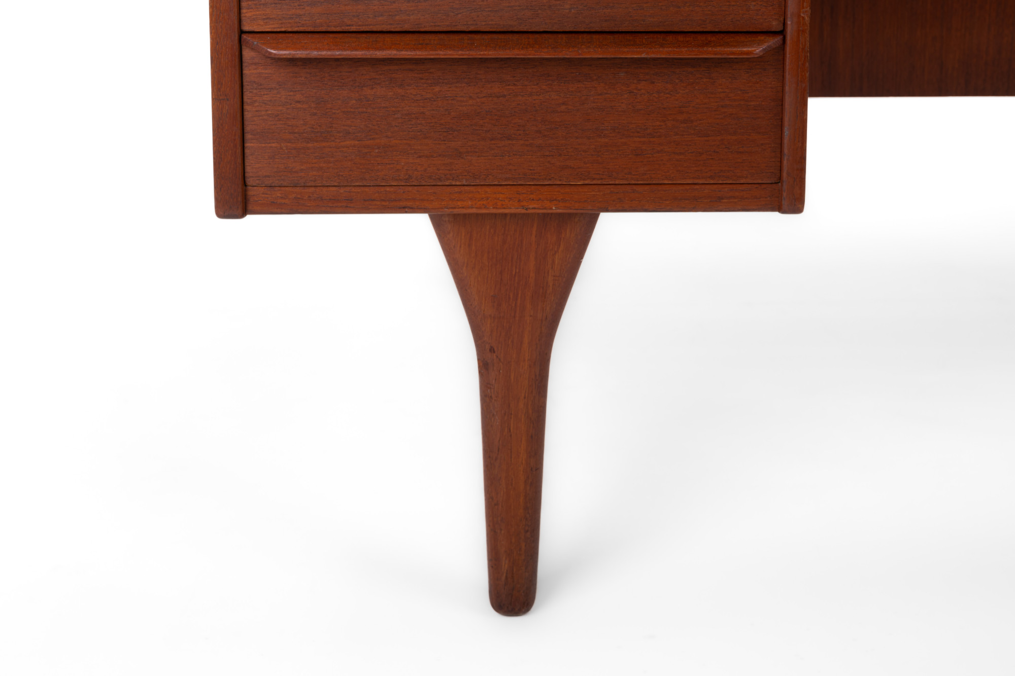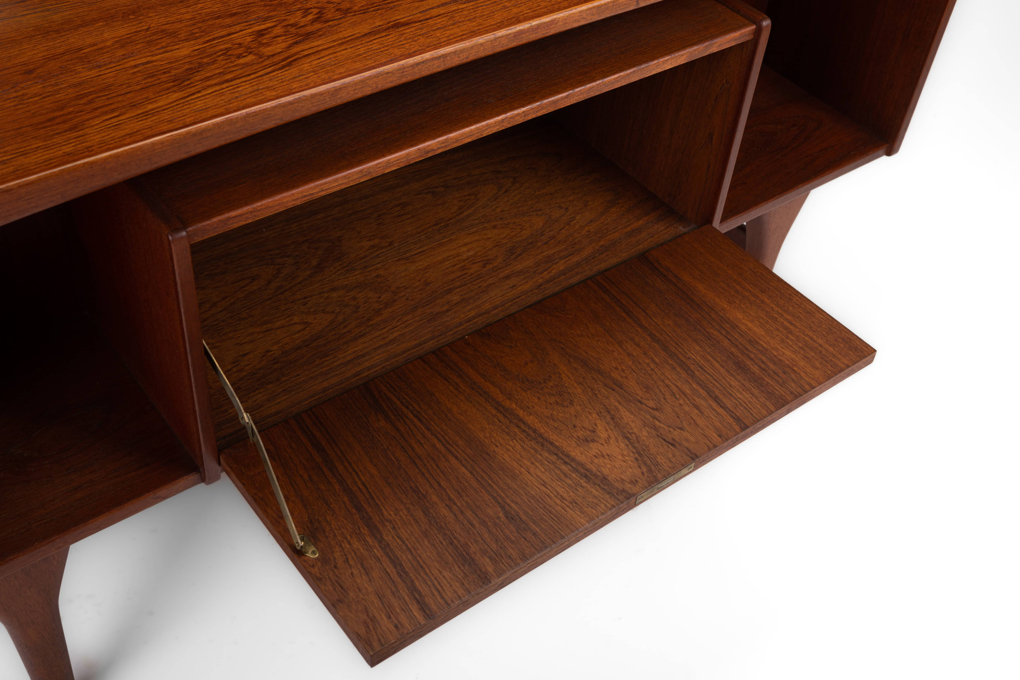 Beautiful vintage writing desk in teak produced by Valdemar Mortensen, Denmark 1960s. There are six drawers and a bar area. This desk is in very good restored condition and marked by the producer.